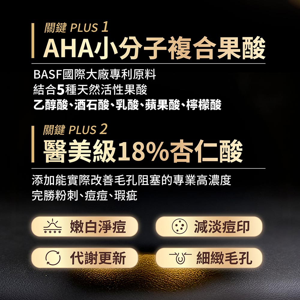 產品功效:淨痘調理、收斂毛孔、亮白嫩膚產品特色:18%高濃度杏仁酸,獨家搭配五種專利天然果酸,功效加乘更有感,專利啤酒多酚高效提升肌膚均勻度,SGS檢驗可抑制痤瘡桿菌高達99%。