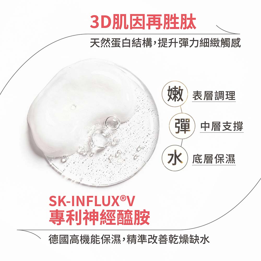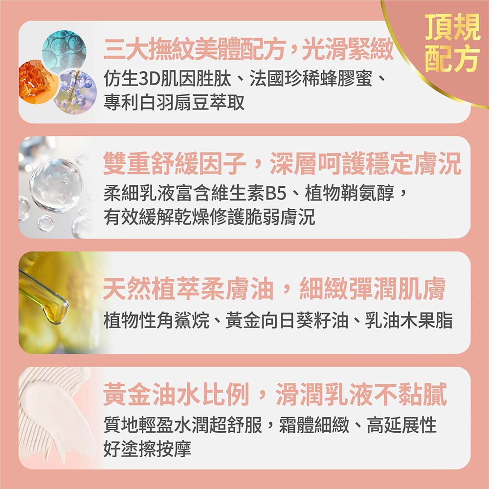 ➤黃金油水比例,淡化肌膚紋路