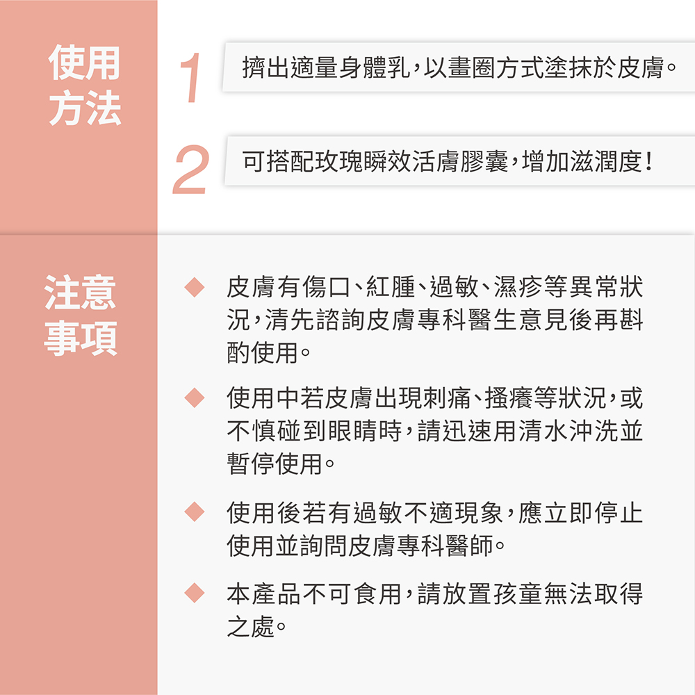 擠取適量無痕身體乳以畫圈的方式塗抹於身體。定期於早上起床、晚上洗澡後使用,搭配輕揉按摩,亦可搭配玫瑰瞬效活膚膠囊,增加滋潤度!