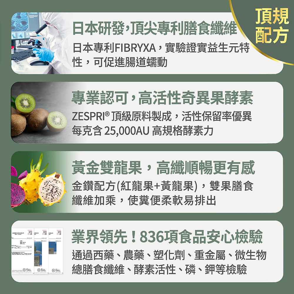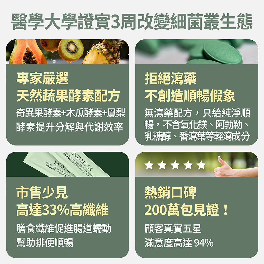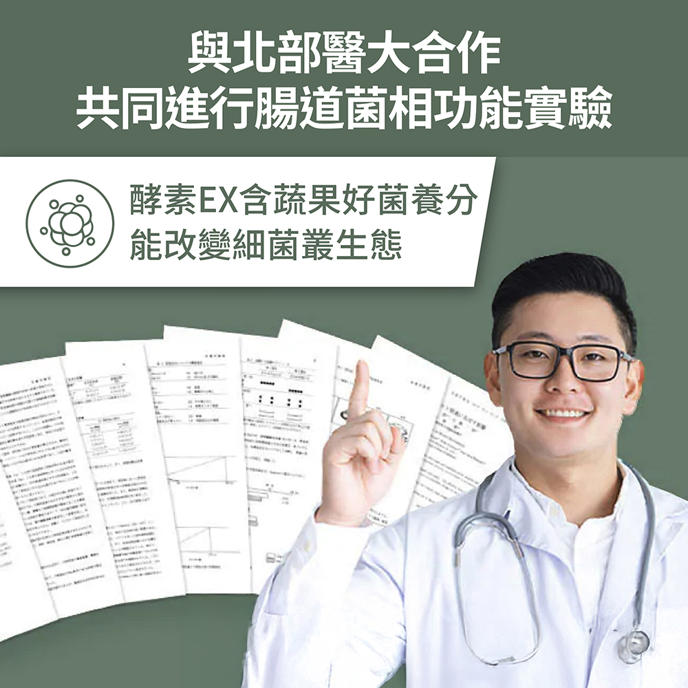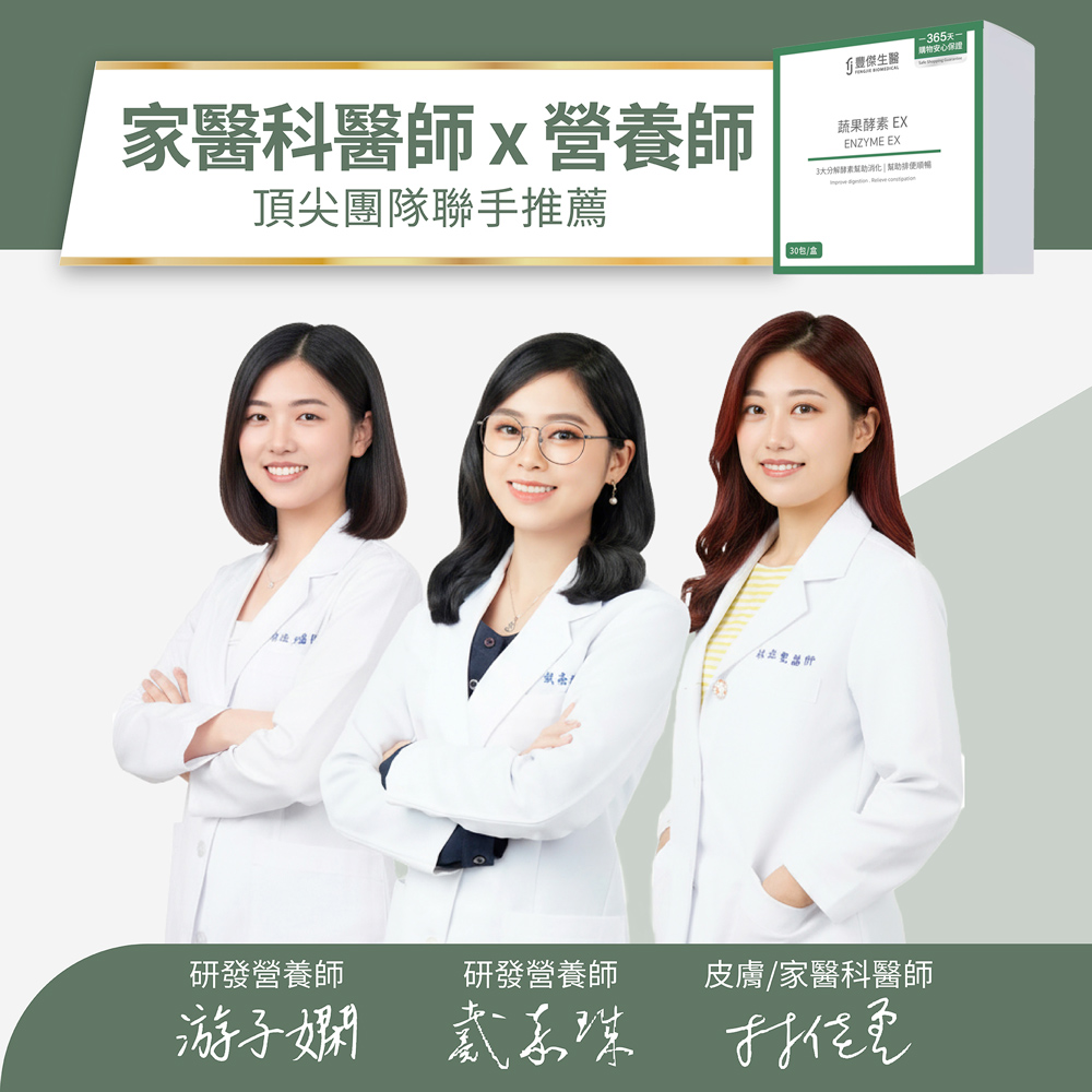 ➤榮獲SNQ國家品質標章、A.A.無添加1星驗證、國家品質金牌獎➤每日1包,飯後或睡前食用較佳➤北部知名醫學大學實驗證實3週改變細菌叢生態➤業界領先,膳食纖維高達33%,幫助排便順暢➤9項歐美日韓專利配方、美國FDA-GRAS成分認證➤Fibryxa專利膳食纖維可促進腸道蠕動➤大豆發酵物、益生元、酵素幫助維持消化道機能➤複方GABA添加,特殊生物活性功能氨基酸,幫助入睡➤全台少有嚴格把關、純天然萃取,不含任何瀉藥成分➤100%全素可食Q1:蔬果酵素怎麼吃?晚餐飯後搭配一杯150-250c.c.的水攪拌食用,水溫勿超過40度,味道為酸甜莓果味~若無幫助入睡調理需求,也可以在任一餐後食用。Q2:酵素可以跟其他產品同時食用嗎?豐傑生醫建議任何產品都不要同時食用喔,因為成分有可能會互相影響,建議間隔30分鐘再食用。Q3:孕婦可以食用蔬果酵素嗎?當然可以,所有人都可以食用。孕婦、哺乳期間也能安心食用。Q4:酵素可以跟益生菌一起吃嗎?可以的!益生菌主要是幫助調整體質、改變細菌叢生態,而蔬果酵素主成分含有專利膳食纖維,不僅可以使排便順暢,同時也是益生菌的食物來源,幫助維持消化道機能更實在。Q5:誰適合食用蔬果酵素EX?不論男女都可以食用!添加專利Fibryxa膳食纖維、大豆發酵物以及洋車前子、決明子、蒟蒻等天然纖維成分,特別推薦給想使排便順暢的人。而GABA則是可以幫助調整體質,幫助入睡!Q6:蔬果酵素EX吃多久會有效呢?保健品並非藥品,建議持續食用七天以上!根據每個人的食用習慣與體質,調理時間也會不同喔!Q7:新版酵素跟以前有什麼不一樣呢?在過去兩年間,我們不斷優化舊版酵素配方,除了提升蔬果的豐富度,還增加了膳食纖維含量,達成了黃金比例的雙效膳食纖維配方。為了提供顧客更大的安心保障,進行了酵素活性與膳食纖維含量檢測。結果顯示,酵素活性不僅高於原料數據,每包酵素更含有「高達33%的膳食纖維」,促進腸道蠕動、幫助排便順暢。最重要的是,我們的蔬果酵素EX不含任何瀉藥成分,不同於市面上許多含有瀉藥成分的酵素,讓你享受純淨的配方,食用更安心。此外,還特別委託專業機構,進行菌相實驗,並且通過SNQ國家品質標章認證,讓產品的有感度與安心度更加卓越。Q8:蔬果酵素有含瀉藥、減肥藥嗎?所有酵素皆經台美檢驗合格。不含瀉藥、減肥藥、西藥成分,請安心食用。Q9:請問可以加進飲料食用嗎?可以的!但碳酸飲料及奶製品不建議。Q10:請問168斷食期間該怎麼吃比較好?可以自由搭配一天中的最後一餐,如果斷食24小時,可以等開始進食後再搭配酵素喔!-------------------------------------------------------------【食用方式】每日飯後日常保養1包,加強調理2-3包,配合150-250c.c.常溫水沖泡飲用,水溫不宜超過40℃。【產品功效】使排便順暢、幫助維持消化道機能、促進新陳代謝、擁有多國專利認證。榮獲2023歐洲品質評鑑大賞、9項歐美日韓專利配方、美國FDA-GRAS成分認證、不含瀉藥成分,安心使用【商品規格】容量規格: 5g/包、 30包/盒保存期限: 2年貨源: 公司貨產地: MIT劑型:粉末【注意事項】1. 補充保健食品期間,每日飲水量需充足(建議: 每公斤體重*35-40c.c.)。2.本品含有大豆、乳糖及其製品,對前述成分過敏者請勿食用。3. 請配合足量水一起食用,對(洋)車前子過敏者請勿食用。4.使用本產品應避免同時飲酒或服用降血壓、鎮靜及癲癇等藥物;孕婦、授乳者、嬰幼兒,須諮詢醫師、營養師方可使用。5.為保持產品最佳品質,開封後仍需密封保存,請於1個月內儘速食用完畢。