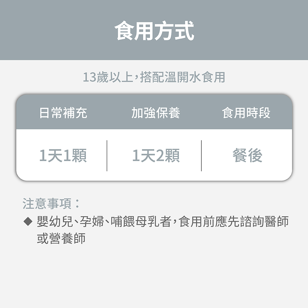 建議13歲以上,日常保養每日1顆,加強調理每日2顆,餐後搭配溫開水食用,一日請勿超過2顆,多食無益。