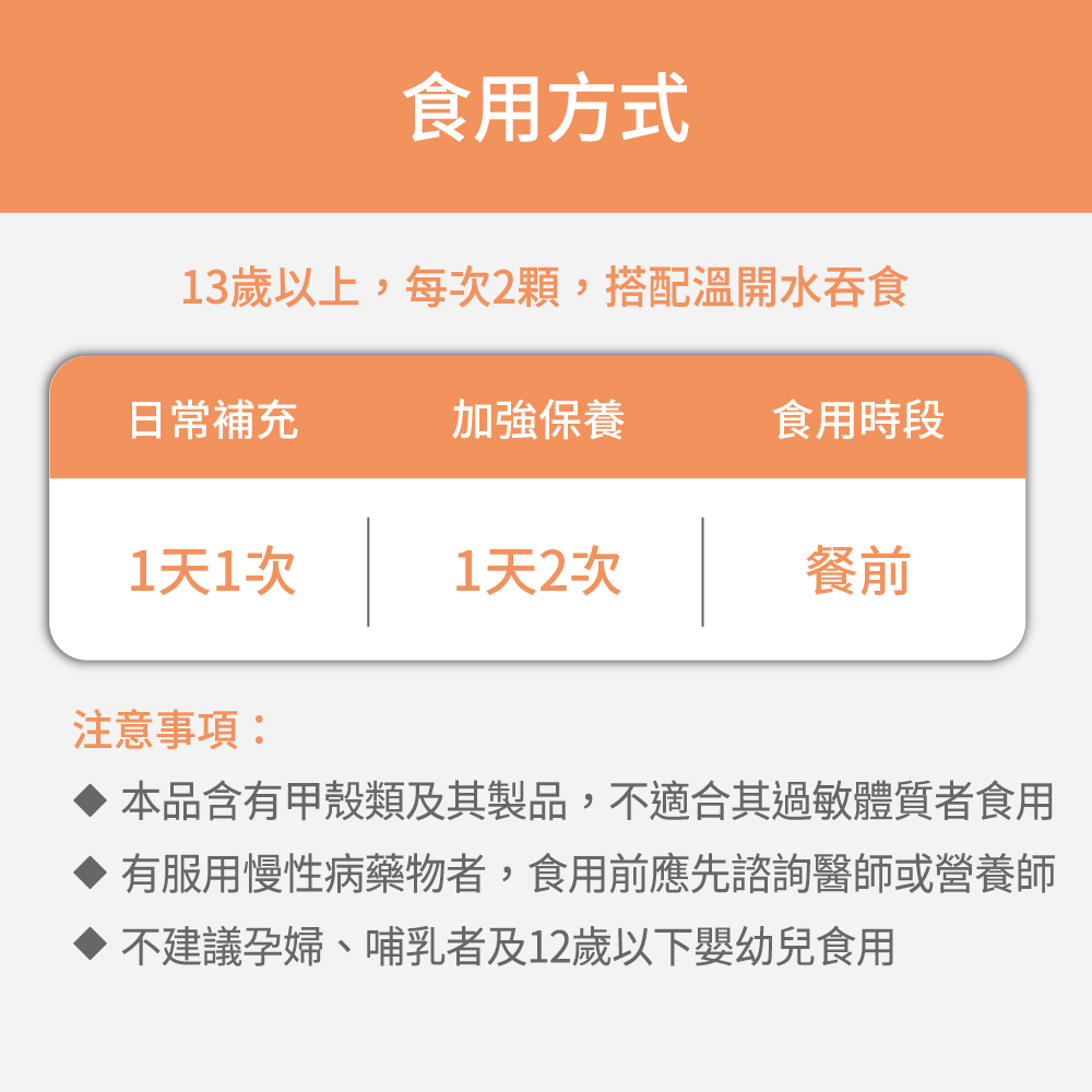 13歲以上,每次2顆,日常保養每日1次,加強保養每日2次,於餐前搭配溫開水食用。