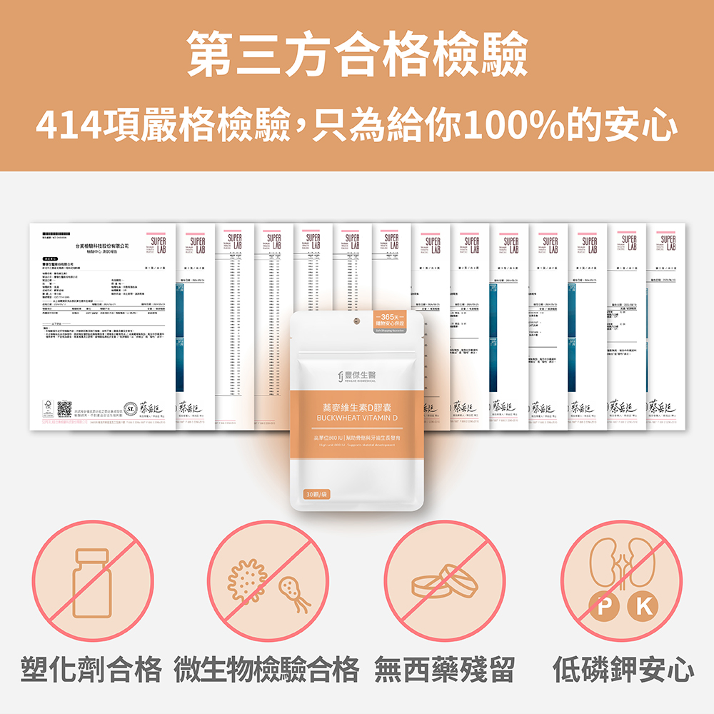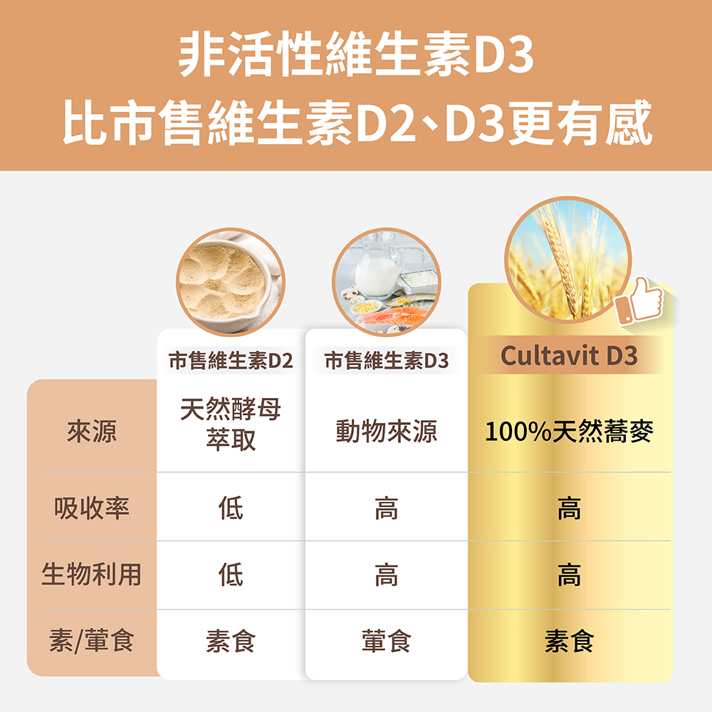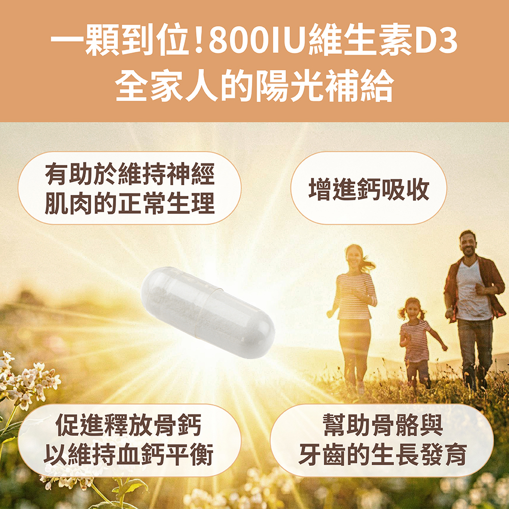 ➤每日1顆,餐後食用➤800 I.U. 高單位維生素 D3,一顆滿足國際標準➤優質 D3 型態好吸收,幫助長效營養補給➤嚴選奧地利天然蕎麥來源,純粹無化學添加物➤ IFS、KOSHER 國際食安認證,孕婦、兒童安心吃➤全台首張通過核可之蕎麥D3單方查驗登記證➤增進鈣質吸收,幫助骨骼與牙齒的生長發育➤業界高規,通過西藥、塑化劑等829項檢驗➤原料獲英國素食協會認證,100%全素可食