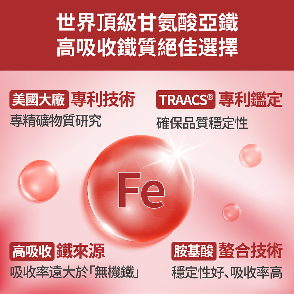 Q1.甘胺酸亞鐵要怎麼吃?是一次吃2-4顆還是分次吃呢?建議每日補充2次,人體吸收效果會比單次高劑量更好,而且也比較不會有副作用。Q2.可以與茶、咖啡、牛奶一起補充嗎?至少間隔1小時以上,避免互相干擾影響吸收。Q3.孕婦跟學童可以補充甘胺酸亞鐵嗎?當然可以,豐傑生醫選用優質大廠原料所生產的安全配方,孕婦及學童都可以安心使用。6歲以下兒童請先諮詢醫師或營養師。Q4.甘胺酸亞鐵可以跟鈣一起補充嗎?不建議一起補充,兩者會互相干擾影響吸收率。建議至少間隔1小時以上,或是隔餐使用。Q5.你們的是二價鐵?還是三價鐵?甘胺酸亞鐵屬於二價鐵。Q6.懷孕期間還可以補充那些營養品?請看我們為您準備的「孕媽咪營養補充建議」懶人包,您可以根據懷孕周期選擇適合的保健食品。Q7.什麼是卡姆果?卡姆果是生長在雨林的灌木果實,外表像一顆葡萄,擁有紫色的果皮與黃色果肉,風味酸中帶甜,含有豐富的鐵質、維生素C、菸鹼酸、胡蘿蔔素等,是當地人營養補充的「超級食物」。---------------------------------------------------------------【使用方式】13歲以上及孕媽咪每天2-4顆,6-12歲每天1-2顆;餐後搭配溫開水使用;每天勿超過4顆,多食無益。【產品功效】補充鐵質、幫助紅潤好氣色,營養補給、幫助維持血球健康,維持神經系統健康。專利甘氨酸亞鐵,高吸收率、同時補充B6及B12雙B營養素、養顏美容、增強體力、葉酸幫助胎兒正常發育與生長【產品特點】✔ 每天2顆,餐後使用✔ 幫助養顏美容✔ 專利甘氨酸亞鐵,高吸收率 ✔ 維生素C幫助鐵及葉酸營養補給✔ 葉酸幫助紅血球形成及胎兒正常發育✔ 同時補充B6及B12雙B營養素✔ 維生素B6增進神經系統健康✔ 養顏美容、增強體力【主要成分】玉米澱粉、卡姆果萃取物(維生素C)、複合式甘氨酸亞鐵(甘氨酸亞鐵、檸檬酸、麥芽糊精、二氧化矽)、硬脂酸鎂、二氧化矽、維生素B6、葉酸、維生素B12【商品規格】容量規格: 300毫克/顆;60顆/袋保存期限: 3年貨源: 公司貨產地: MIT劑型:膠囊【注意事項】6歲以下兒童,請先諮詢醫師或營養師。