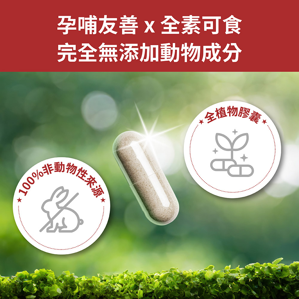 玉米澱粉、卡姆果萃取物(維生素C)、複合式甘氨酸亞鐵(甘氨酸亞鐵、檸檬酸、 麥芽糊精、二氧化矽)、硬脂酸鎂、二氧化矽、維生素B6、葉酸、維生素B12。