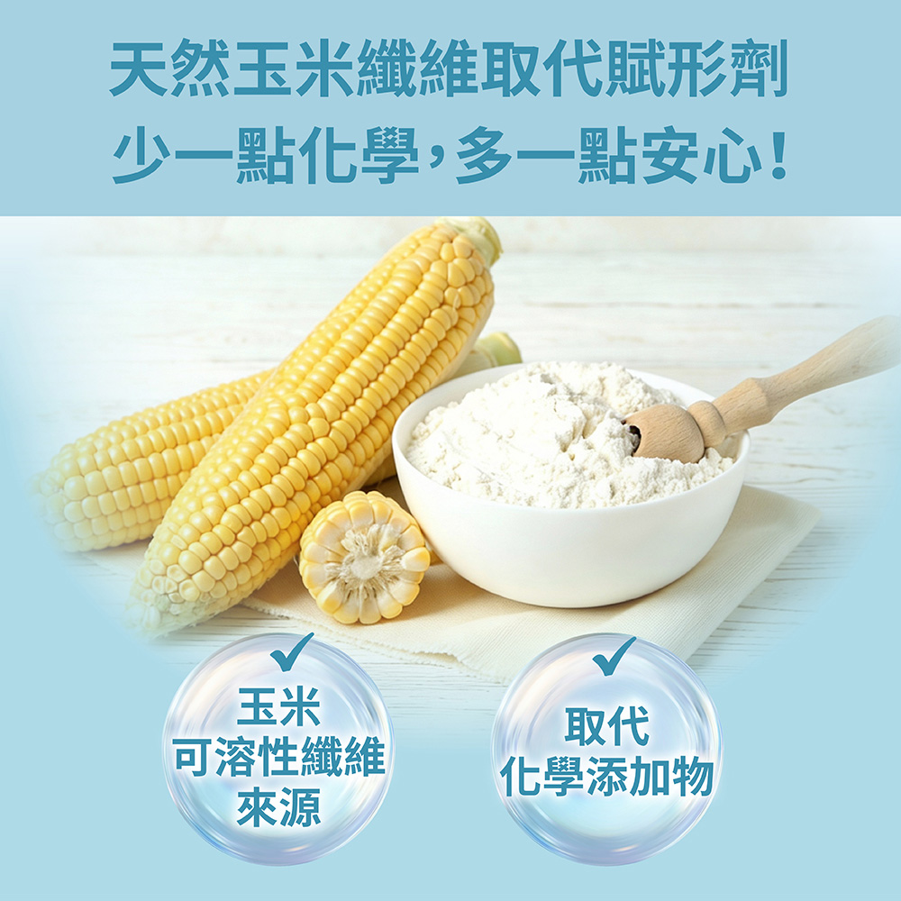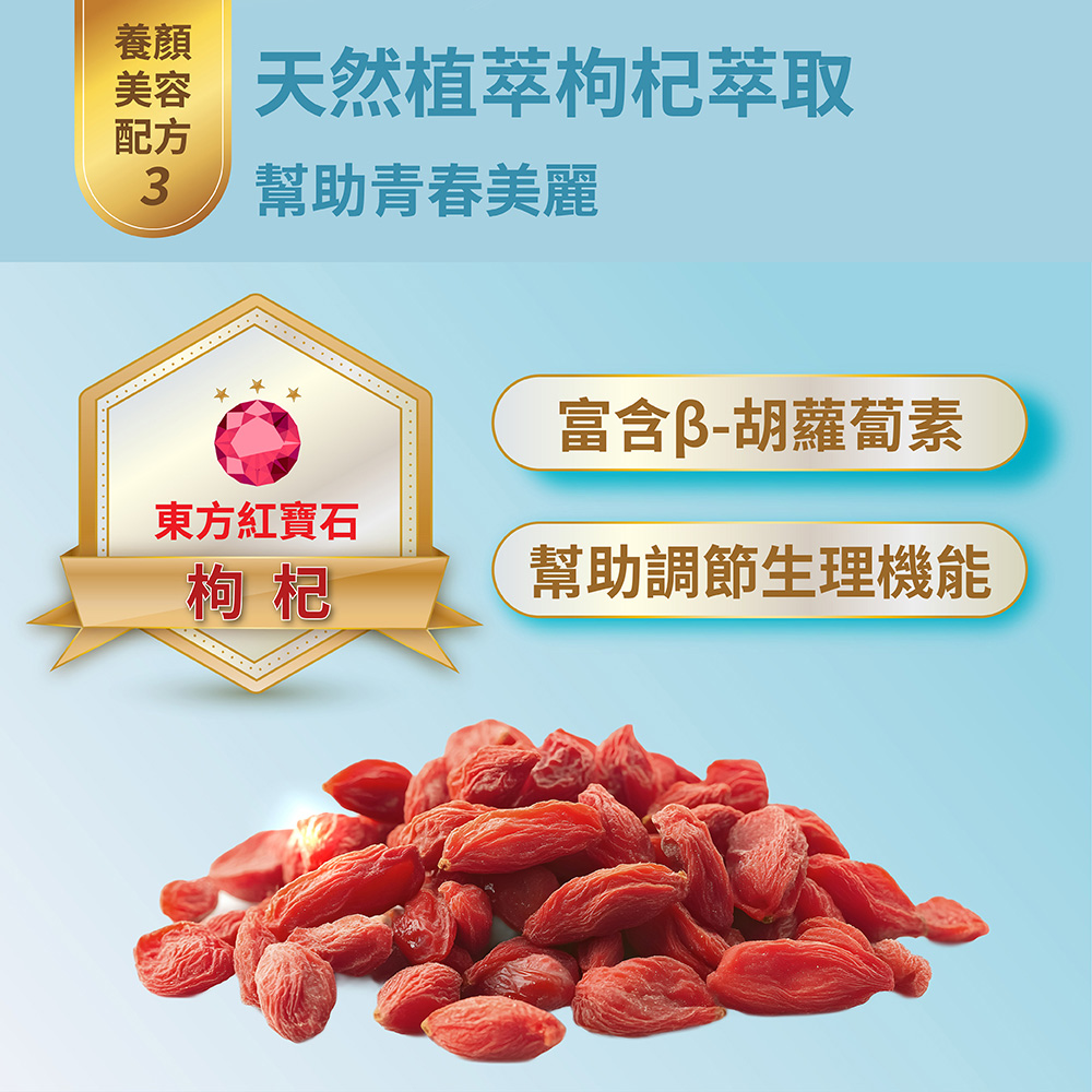 卡曼橘萃取物(含麥芽糊精)、枸杞萃取物(含麥芽糊 精)流行鏈球菌發酵物(含透明質酸鈉)、玉米來源可溶性纖維。