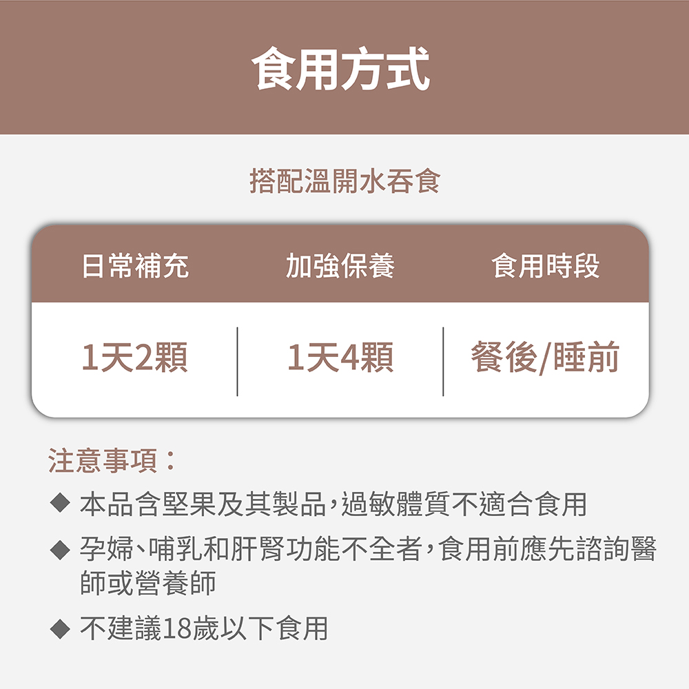 ➤ 每日2-4顆,飯後搭配溫開水食用