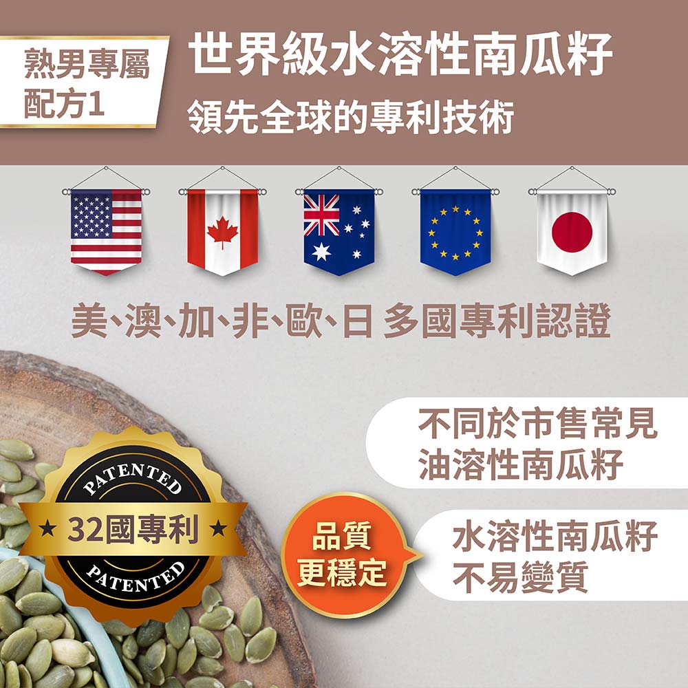 Q1.女性可以吃南瓜籽嗎?可以,這一配方雖然熟男為主要適合族群,但配方內容也很適合擁有相同需求的熟女以及產後婦女喔!我們使用植萃南瓜籽及茄紅素等天然原料,可以放心食用。Q2.南瓜籽要怎麼吃?睡前或餐後?日常保養每日2顆,加強保養4顆,飯後搭配溫開水食用。Q3.直接吃南瓜籽有用嗎?如果直接生食南瓜籽其實作用不大,市面上的南瓜籽多為油溶性,因此活性物質易於加工過程氧化產生油耗味,導致營養價值下降,影響產品穩定性,且有效成分尚不明確。而豐傑的專利南瓜籽是屬於全球珍稀水溶性南瓜籽來源,無雜質吸收速度快,能夠幫助調整體質、健康維持;若食用一般南瓜籽主要攝取到的是脂肪類營養素喔!Q4.孕婦跟小孩可以吃南瓜籽嗎?本產品適用於35歲以上的熟齡男女,18歲以下的青少年正常來說不需要補充喔!產後若無哺乳需求,可以補充來幫助調整體質、調節生理機能。Q5.如何挑選南瓜籽產品?選擇南瓜籽產品時需注意:品種來源、專利技術萃取。而豐傑使用的高濃縮萃取水溶性南瓜子膠囊,目前是市場的頂規與主流。Q6.素食可以食用嗎?專利南瓜籽+茄紅素的膠囊殼屬於動物膠質成分,素食者可以打開膠囊食用原料粉末。Q7.本產品中的白鳳豆是什麼?與白腎豆不同嗎?白鳳豆為幫助調節生理機能,主要是針對熟齡男女喔!而白腎豆屬於幫助促進新陳代謝,適合愛吃米麵的成人。---------------------------------------------------------------【使用方式】日常保養每日2顆,加強保養4顆,飯後搭配溫開水食用。【產品功效】攝護腺好朋友、幫助調節生理機能。高濃度萃取,多國專利男性配方、天然植化素茄紅素加成補給、全球珍稀水溶性南瓜籽來源、搭配多項專利成分效果更升級【產品特點】✔ 每日2-4顆,飯後搭配溫開水食用✔ 全球珍稀水溶性南瓜籽來源✔天然植化素茄紅素加成補給✔搭配多項專利成分效果更升級✔精選礦物鋅男性必備營養素✔ 南瓜籽高濃度萃取高保健✔ 熟齡男性保養【主要成分】專利南瓜籽萃取物、麥芽糊精、蕃茄萃取物(含茄紅素)、刀豆萃取物(專利白鳳豆)、葡萄糖酸鋅、專利黑麥花粉、硬脂酸鎂【商品規格】容量規格: 500毫克/顆;30顆/袋保存期限: 3年貨源: 公司貨產地: MIT劑型:膠囊【注意事項】1.本品含有堅果及其製品,不適合其過敏體質者食用。2.孕婦、哺乳以及肝腎功能不全者食用前應先諮詢醫師或營養師。3.不建議18歲以下食用。