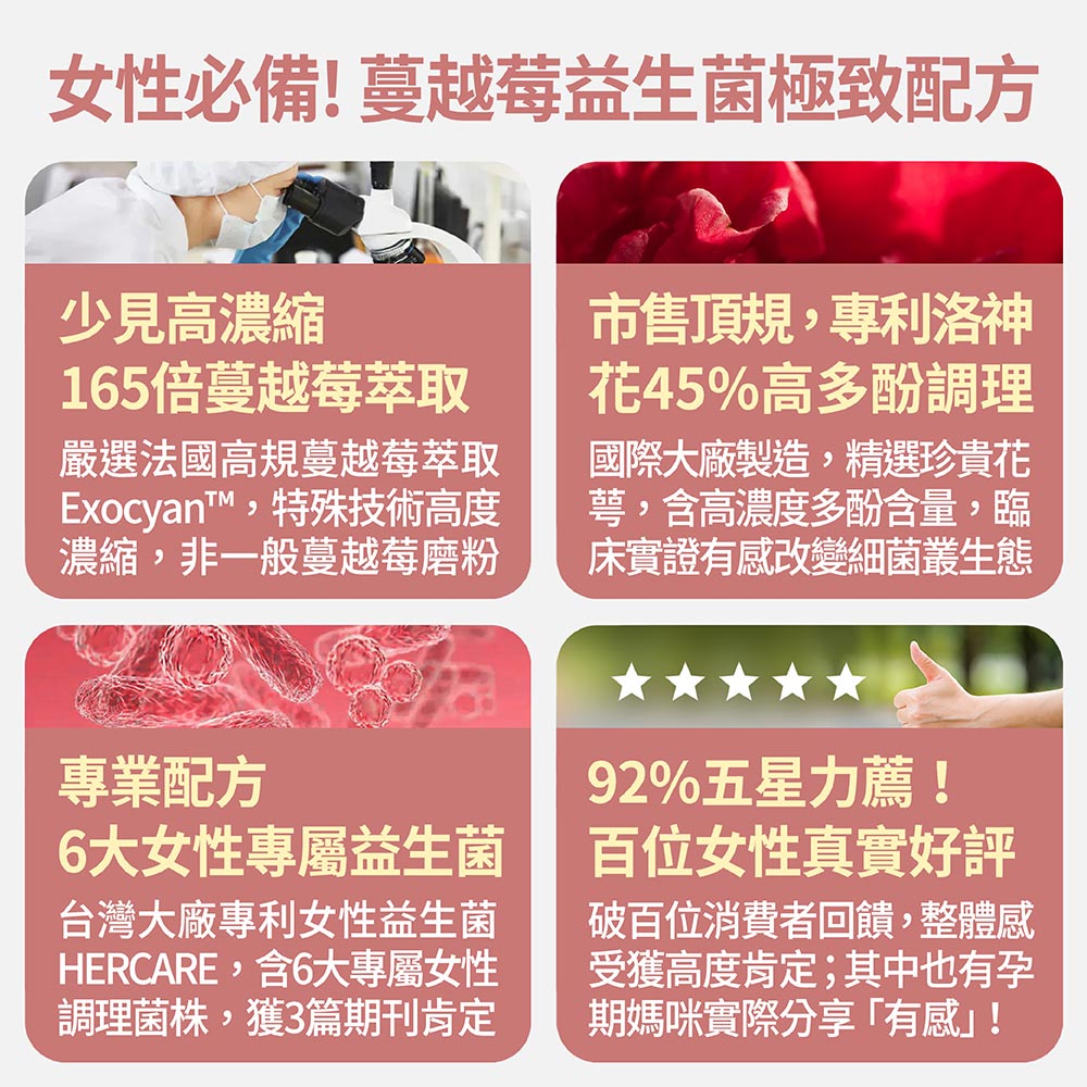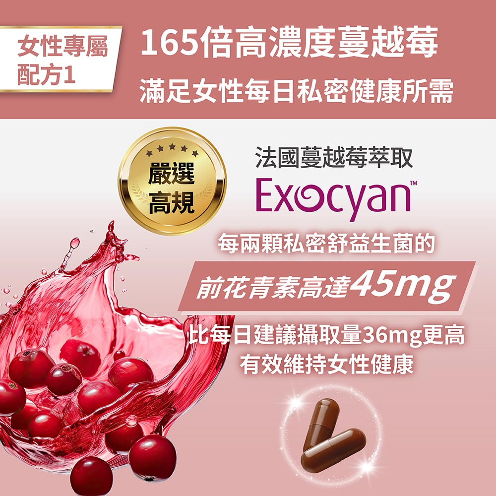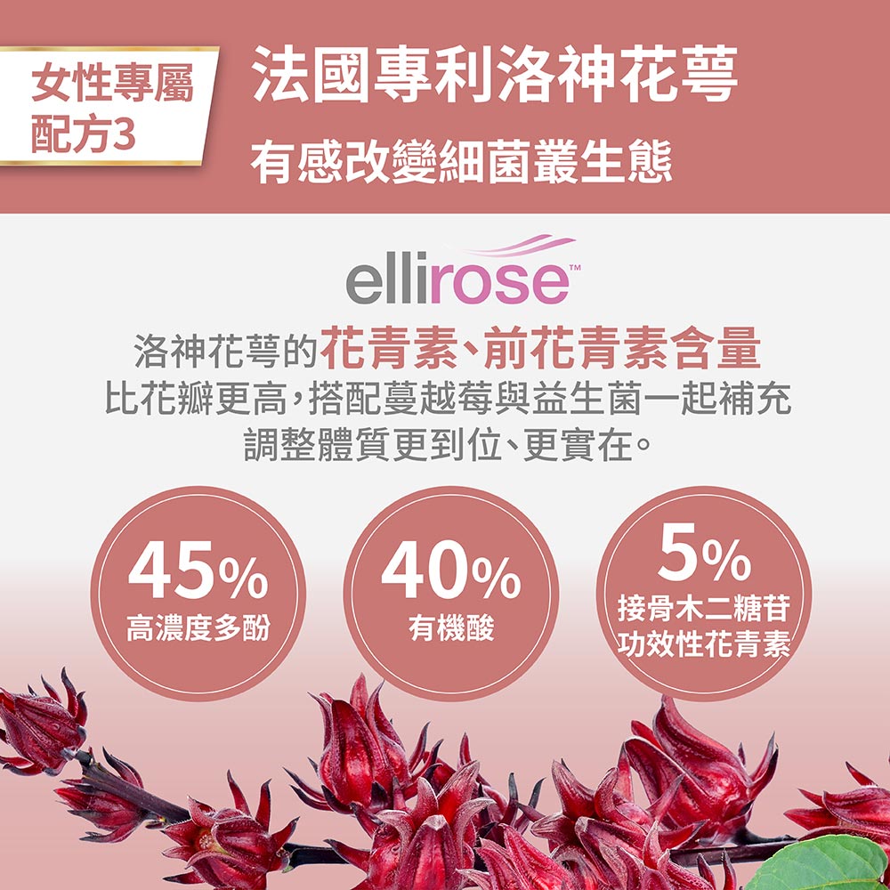 包含專利洛神花萼萃取ellirose™、法國蔓越莓萃取物Exocyan™、多株複合型冷凍乾燥乳酸菌粉SynForU®-HerCare(乳酸菌(植物乳桿菌 LP115、瑞士乳桿菌LA25、醱酵乳桿菌 LF26、鼠李糖乳桿菌 LRH10、副乾酪乳桿菌LPC12、乳酸乳桿菌LDL114)等,完整成分請看下方成分表喔。