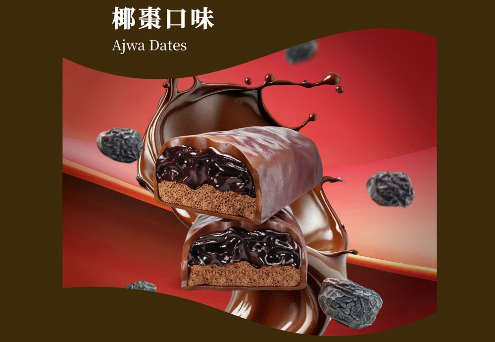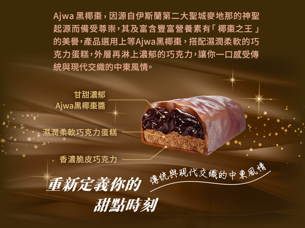 Ajwa黑椰棗源自伊斯蘭第二大聖城麥地那的神聖起源而備受尊崇,有「椰棗之王」的美譽,產品精選上等Ajwa黑椰棗製作,其天然甘甜,搭配濕潤柔軟的巧克力蛋糕,外層再裹上濃郁巧克力,傳統與創新完美融合,每一口都是奢華的極致享受。