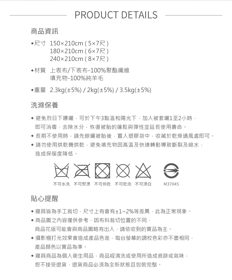◆清潔保養方式:1.適合乾洗,切忌水洗以免被胎變形,並請交由專業洗衣店處理2.建議在下午3點溫和陽光下,加入被套曬1至2小時,可達到消毒,去溼及殺菌之效果,可恢復彈性,延長使用期限.3.若沾染污漬,可使用中性洗劑先做局部清洗,再送至專業洗衣店處理.4.不可水洗及烘乾.5.換季時請使用包裝袋收藏,請勿壓縮,放置於通風處即可.◆縮率和色牢度:縮率3% 色牢度4級◆退貨條件:除商品本身有瑕疵可辦理退貨,商品一經使用或損毀即不可退換貨,退貨必須保留紙箱及商品組合之齊全及完整性。注意事項:.注意事項一:商品如經拆封、使用過、清洗過或拆解以致缺乏完整性及失去再販售價值時,恕不接受退換貨!.注意事項二:此商品圖為參考用之情境圖示,產品內容以規格敘述內容為準.注意事項三:因布料裁切位置的不同,部份花版可能會與商品圖略有出入,請以收到的實品為主,網頁圖片因拍攝與螢幕解析度關係,與實品略有差異,實際顏色以出貨為主.注意事項四:商品若欲辦理退款依法需先恢復商品原狀,否則需支付恢復商品原狀之費用方得辦理退款。(新品瑕疵除外)。.注意事項五:商品退換貨,需有外包裝破壞袋包覆,如商品提袋包裝汙損將無法退換貨,需另補償整新費。.注意事項六:為了保障雙方權益,請在拆封過程中務必全程錄影,以確保商品是否遺漏、缺貨、瑕疵品(商品缺件、汙漬)等,包裹/商品有問題請於7天商品鑑賞期內,附上完整錄影檔為依據告知,逾期恕不予受理!
