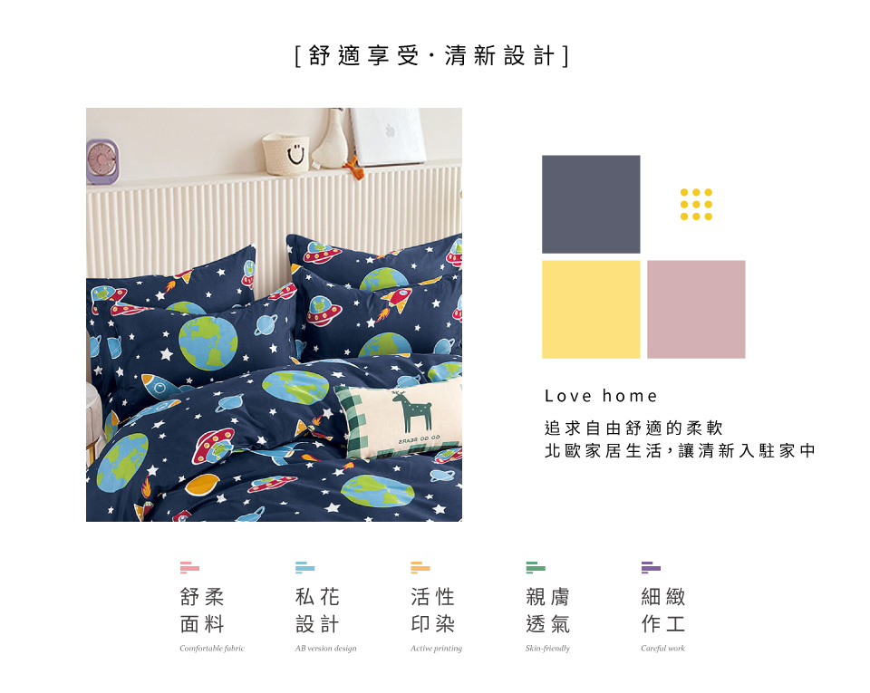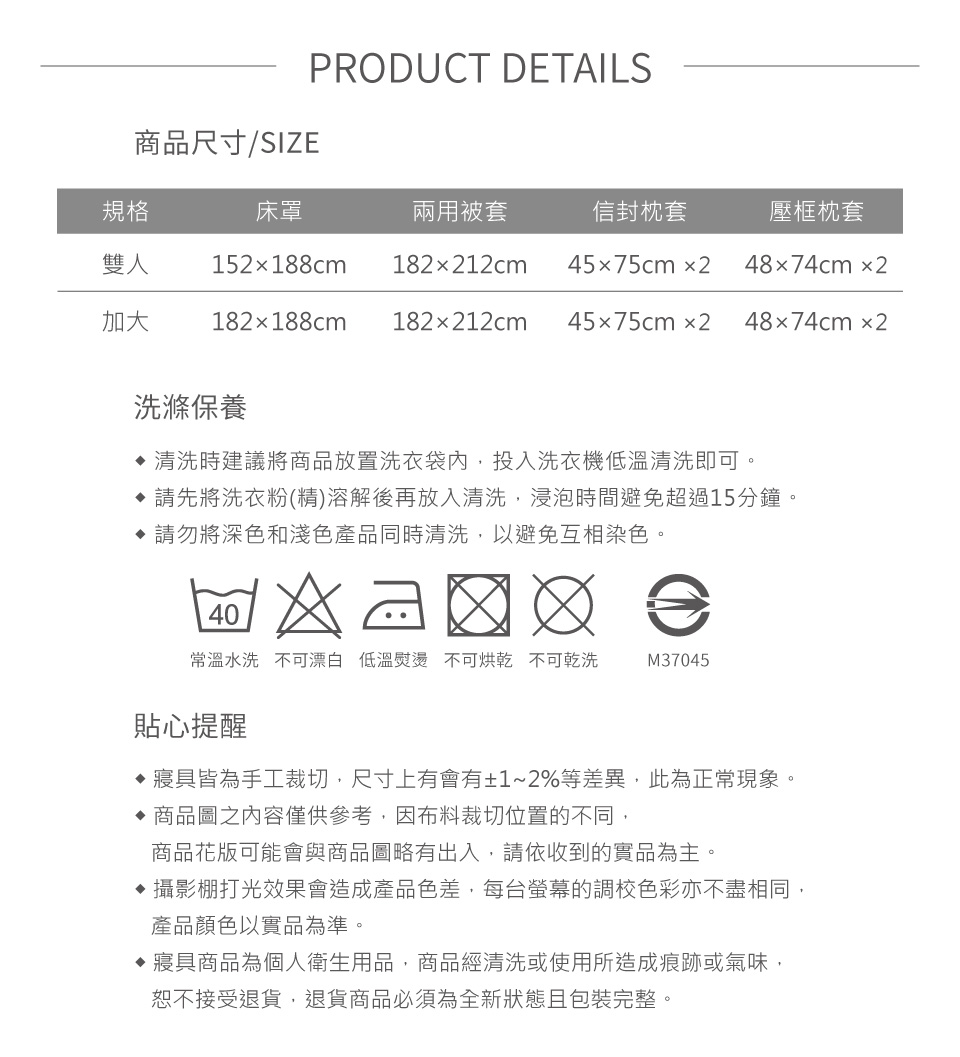 ◆ 保養方式:1. 初次使用前,可先將布翻面下水清洗一次,將表面的漿質及印染浮色洗掉,使用起來會比較柔軟,將來清洗時也不大容易褪色。2. 建議清洗時可放入大型洗衣袋後再清洗,同時,清洗時淺色的要與深色分開洗滌,避免顏色互染。3. 洗滌方式為:先將中性洗滌劑倒入洗衣機的水中,水溫不要超過30℃ ,待洗滌劑完全溶解再放入床包組,注意浸泡時間不要超過20分鐘。4. 請勿使用強力漂白清洗劑。5. 清洗後脫乾並置於室外通風處自然風乾。