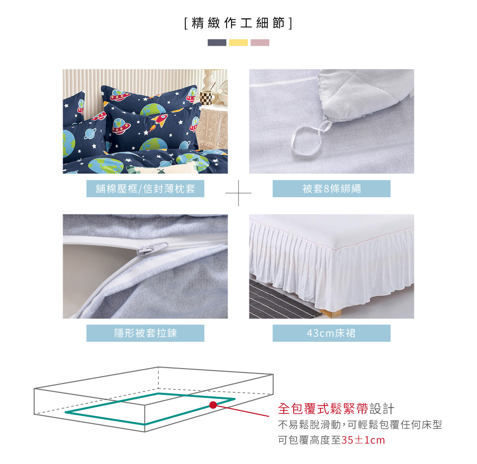 ☆獨家花版設計 熱銷花款☆100%雪絨棉 工藝精緻☆活性環保印染 色彩鮮明◆產品內容/材質/清潔方式:◆雙人鋪棉床罩x1-5x6.2尺(152x188公分)/可包覆床墊高度:約35±1公分/床裙高度 :約40±1公分◆舖棉兩用被x1-6x7尺(182x212公分)◆歐式壓框薄枕套x2-48x74公分◆美式薄枕套x2-45x75公分