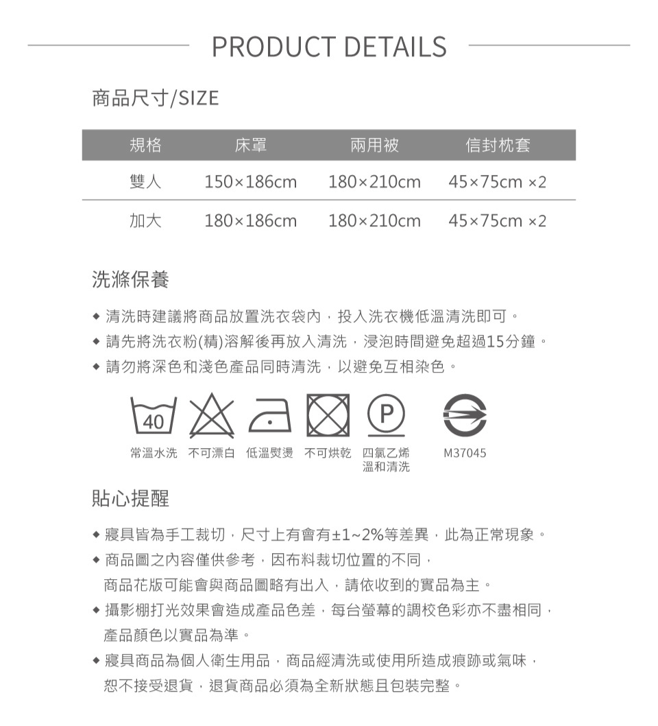 ◆清潔保養方式-可水洗/不可烘乾/不可漂白/勿使用強力漂白清潔劑/浸泡時間請勿超過20分鐘/建議可放入大型洗衣袋後再清洗(因深色布料請勿使用含漂白劑之洗劑,盡量避免浸泡,深淺色寢具請分開清洗)