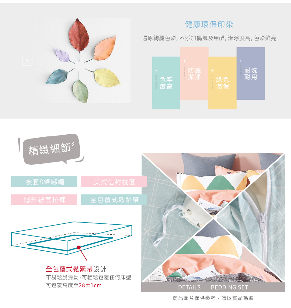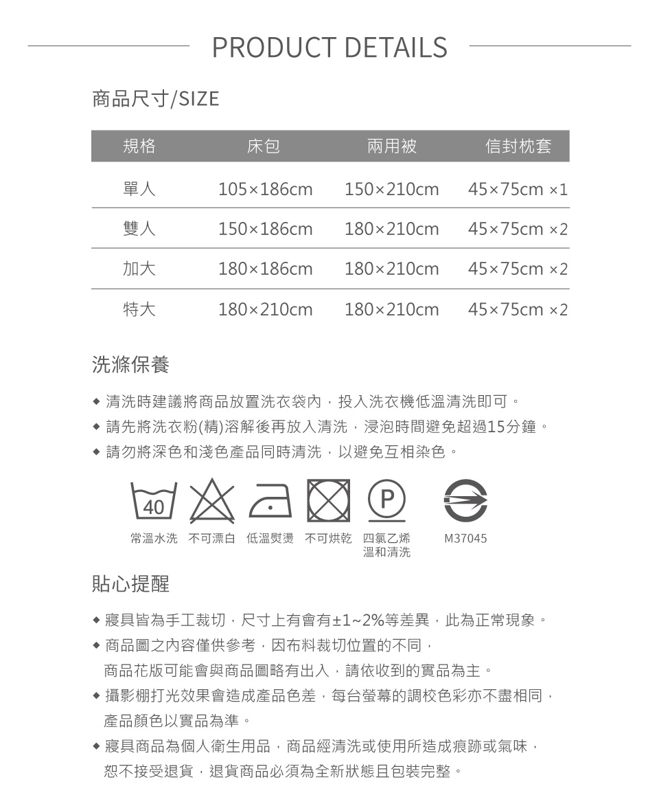 .顏色-如產品圖示,網頁圖片因拍攝關係,與實品略有差異,實際顏色及款式以出貨為主 .清潔保養方式-可水洗/不可烘乾/不可漂白/勿使用強力漂白清潔劑/浸泡時間請勿超過20分鐘/建議可放入大型洗衣袋後再清洗(因深色布料請勿使用含漂白劑之洗劑,盡量避免浸泡,深淺色寢具請分開清洗).本產品組合為「薄床包」非「床罩」-即不包含裝飾用之床裙,被套為舖棉兩用被(可入棉被).因個人衛生問題本,產品將使用或下水清洗後恕不接受退換貨.此商品圖為參考用之情境圖示,產品內容以規格敘述內容為準.因布料裁切位置的不同,部份花版可能會與商品圖略有出入,請以收到的實品為主.請務必於鑑賞期內先確認尺寸規格無誤後再使用及下水