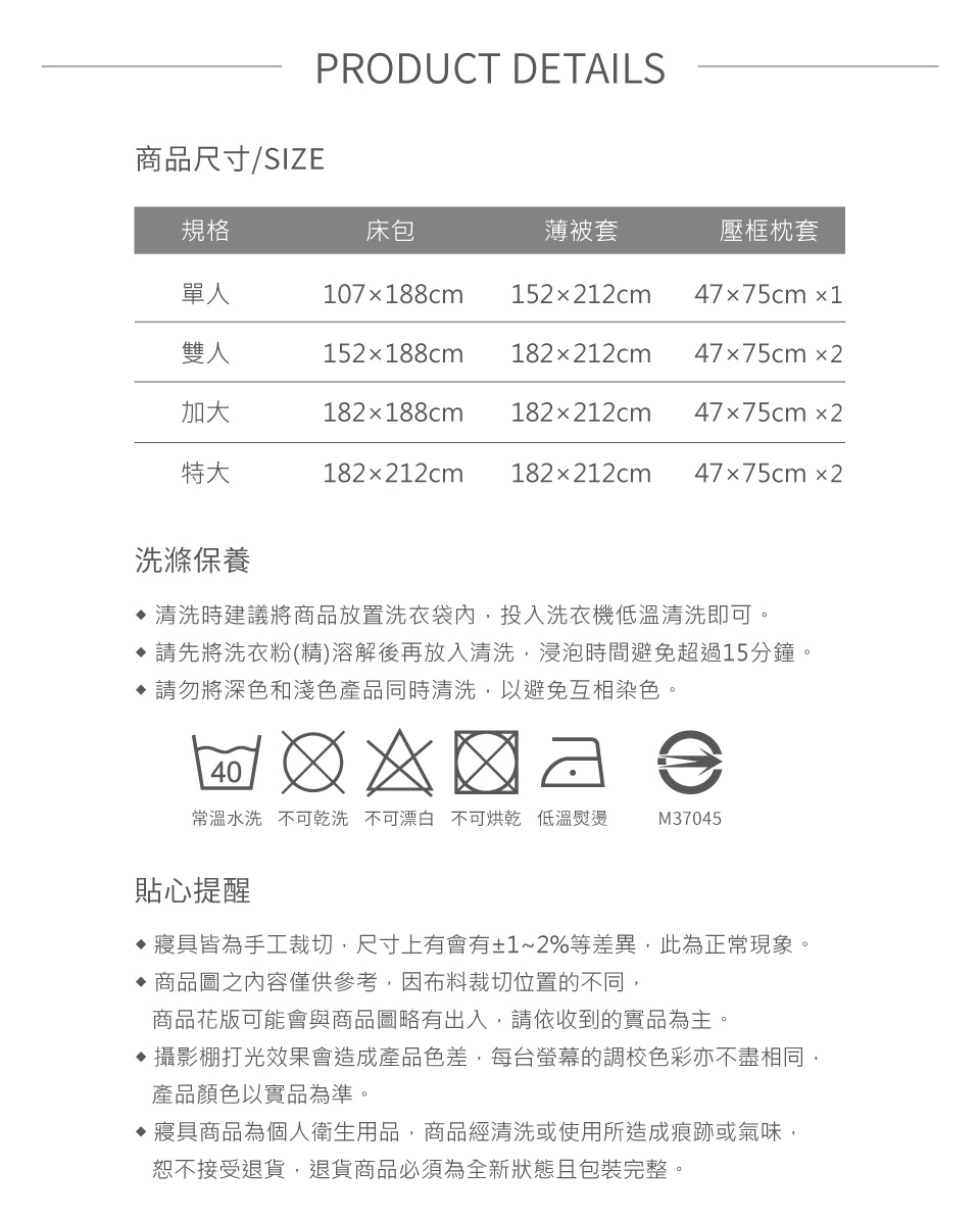 ◆因本商品屬高單價寢具,收到商品後請確認尺寸及商品狀況無誤後再使用~◆商品組合:單人全包覆式薄床包x1+壓框薄被套x1+歐式壓框薄枕套x1;共3件∕組◆產品內容∕材質∕清潔方式:◆單人薄床包x1-3.5x6.2尺(107x188公分) ∕可包覆床墊高度:35±1公分◆壓框薄被套x1-5x7尺(152分x212公分)(裝飾壓框約5±1公分)◆歐式壓框薄枕套x1―47x75公分(裝飾壓框約5±1公分).材質―表布/底布:100%萊賽爾纖維(天絲)(經緯紗60/60).顏色-如產品圖示,網頁圖片因拍攝關係,與實品略有差異,實際顏色以出貨為主.產地-中國(台商監製)◆清潔保養方式:可水洗/不可烘乾/不可漂白/勿使用強力漂白清潔劑/浸泡時間請勿超過20分鐘/建議可放入大型洗衣袋後再清洗(因深色布料請勿使用含漂白劑之洗劑,盡量避免浸泡,深淺色寢具請分開清洗) 請使用寢具專用洗衣袋清洗◆注意事項:.注意事項一:商品如經拆封、使用過、清洗過或拆解以致缺乏完整性及失去再販售價值時,恕不接受退換貨!.注意事項二:此商品圖為參考用之情境圖示,產品內容以規格敘述內容為準.注意事項三:商品若欲辦理退款依法需先恢復商品原狀,否則需支付恢復商品原狀之費用方得辦理退款。(新品瑕疵除外)。.注意事項四:商品退換貨,需有外包裝破壞袋包覆,如商品提袋包裝汙損將無法退換貨,需另補償整新費。.注意事項五:為了保障雙方權益,請在拆封過程中務必全程錄影,以確保商品是否遺漏、缺貨、瑕疵品(商品缺件、汙漬)等,包裹/商品有問題請於7天商品鑑賞期內,附上完整錄影檔為依據告知,逾期恕不予受理!.注意事項六:請勿以粗糙之衣物(如竹蓆、釘釦..等)或身體皮膚粗糙部位直接磨擦布面,以免造成布面起毛球/繡線脫落之狀況,刺繡款有尾線頭,為正常現象,請勿剪除。.注意事項七:送達地點有否限制:限台灣本島地區,外島恕不接單
