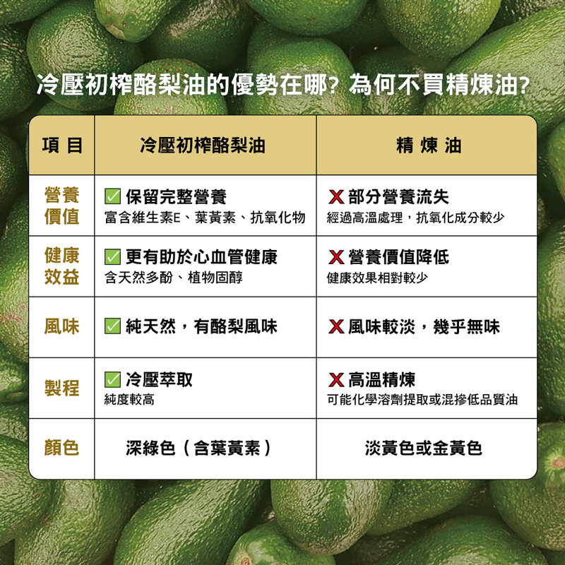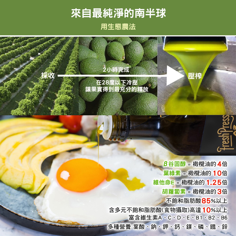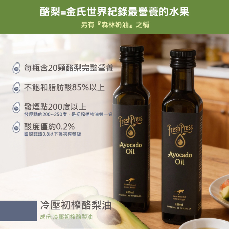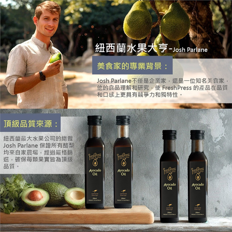 【FreshPress】冷壓初榨酪梨油(250ml)✦ 酸度突破0.3%極限✦ 每一瓶使用20顆酪梨✦ 紐西蘭原瓶進口為什麼是「頂級」冷壓初榨酪梨油? 經澳洲實驗室(NATA)分析結果,FreshPress酪梨油酸度僅0.2%。在國際橄欖油協會的分級標準中,是遠低於最高標準,為真正的頂級油品。食用油的酸度,指油品中「游離脂肪酸」含量,數值越高表示油品氧化程度高,數值越低表示保留的營養成分與純淨度越高。小小冷知識,頂級初榨(Extra Vrgin),酸度需小於0.8%,不可添加任何化學成分或以任何化學方式處理。初榨(Virgin),酸度需在0.8-2%之間,風味稍差,但仍保留果香。✦ 產品為天然初榨無人工添加物,靜放一段時間會產生沉澱,屬於正常現象,請放心食用品 名:FreshPress冷壓初榨酪梨油(250ml)容 量:250ml / 瓶成 分:酪梨油添加物:無原產地/國:澳洲有效期限:3年保存方式:常溫避光、無須冷藏■ 代理商名稱 : 好健康國際有限公司■ 代理商電話 : 02-26755234■ 代理商地址 : 238新北市樹林區千歲街57-7號1樓■ 食品業者登錄字號 : H-153997270-00000-7