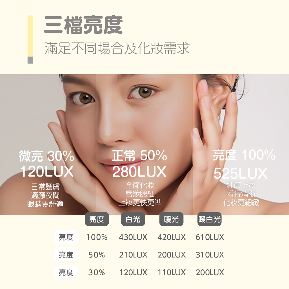 💡 三色亮度可調,依照妝感自由切換