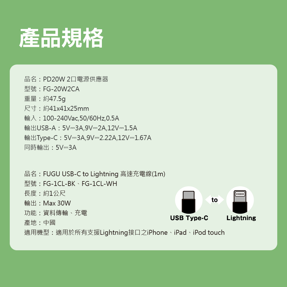 【FUGU】PD20W 2孔快充頭 BSMI認證 贈 C to Lightning 1M充電線/APPLE充電線