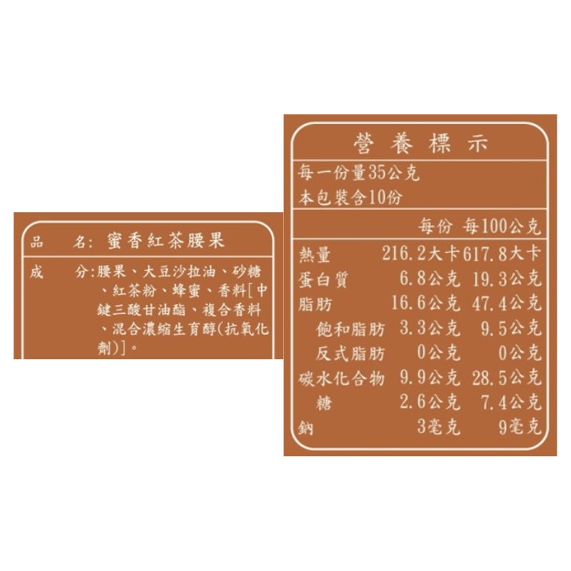 蜜香紅茶風味,獨特誘人:以台灣蜜香紅茶為靈感,融入腰果中,帶來天然蜜香與清新茶韻,口感層次豐富。