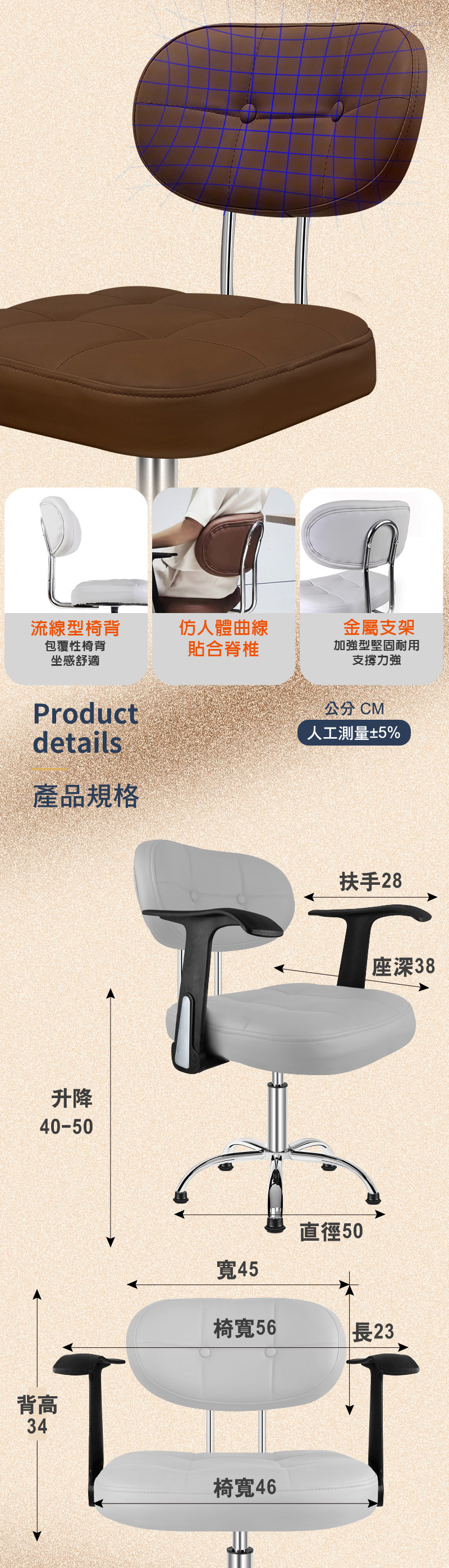 材質:坐布-PU皮革 包覆海綿;支架、扶手-電鍍金屬;椅輪-固定腳墊