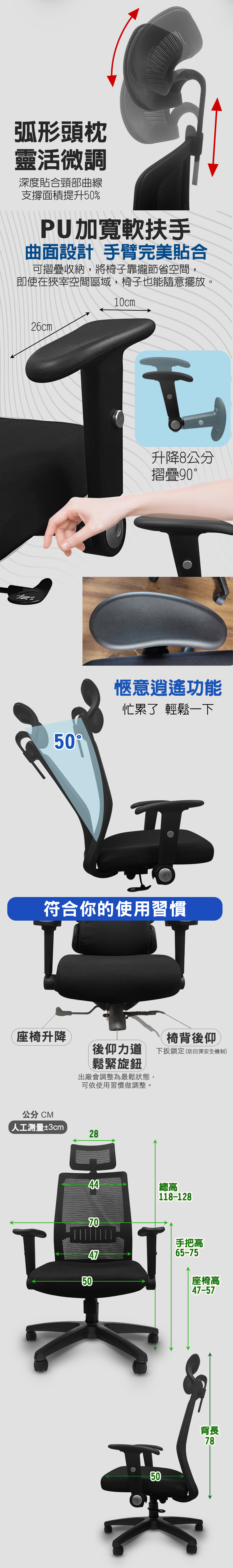 配置: 椅背-彈性透氣網布 坐墊-彈性網布(PU泡棉) 腳架-尼龍五爪腳架 椅輪-全黑帶亮圈(雙輪單軸承含飾蓋) 材質:透氣網布、PU扶手、尼龍 組裝方式:無須組裝、拆封可用 乘載重量:靜壓約100公斤 尺寸:詳情請見商品內文圖 產地:台灣 注意事項: ◆大約1~3個工作天內送貨到府(不含假日)。 ◆購買時請注意商品尺寸大小測量是否合適您的辦公空間再進行下單,避免一切退換貨之手續影響您的權益。 ◆簽收商品前,請先留意貨物是否完整,若有明顯破損損壞等狀況,不簽收並拒收;若已簽收不拆包裹拍照保留狀況聯繫客服處理相關事宜。 ◆辦理退貨商品必須是全新狀態且包裝完整,商品退回若包裝不完整造成運送損傷將會影響你退貨權限,請特別注意。 ◆賣場商品圖因電腦螢幕設定差異會略有不同,請以實品顏色為準,敬請見諒! ◆商品皆由台灣師傅手工製作範圍稍差距為正常。 ◆商品免組裝,拆封即可使用,滾輪也是裝好的,運送過程中會因推椅子上下貨車滑動而沾上灰塵是正常的,並非瑕疵品!只要擦拭過就沒問題喔! ◆貨運認定之困難配送區域(山區、鄉鎮、所有公家機關、學校、醫院、百貨公司、世貿中心、服務區),不做配送;貨下一樓,不做上樓層等附加運送。"有配送地點疑慮,建議下單前與客服聯繫確認"