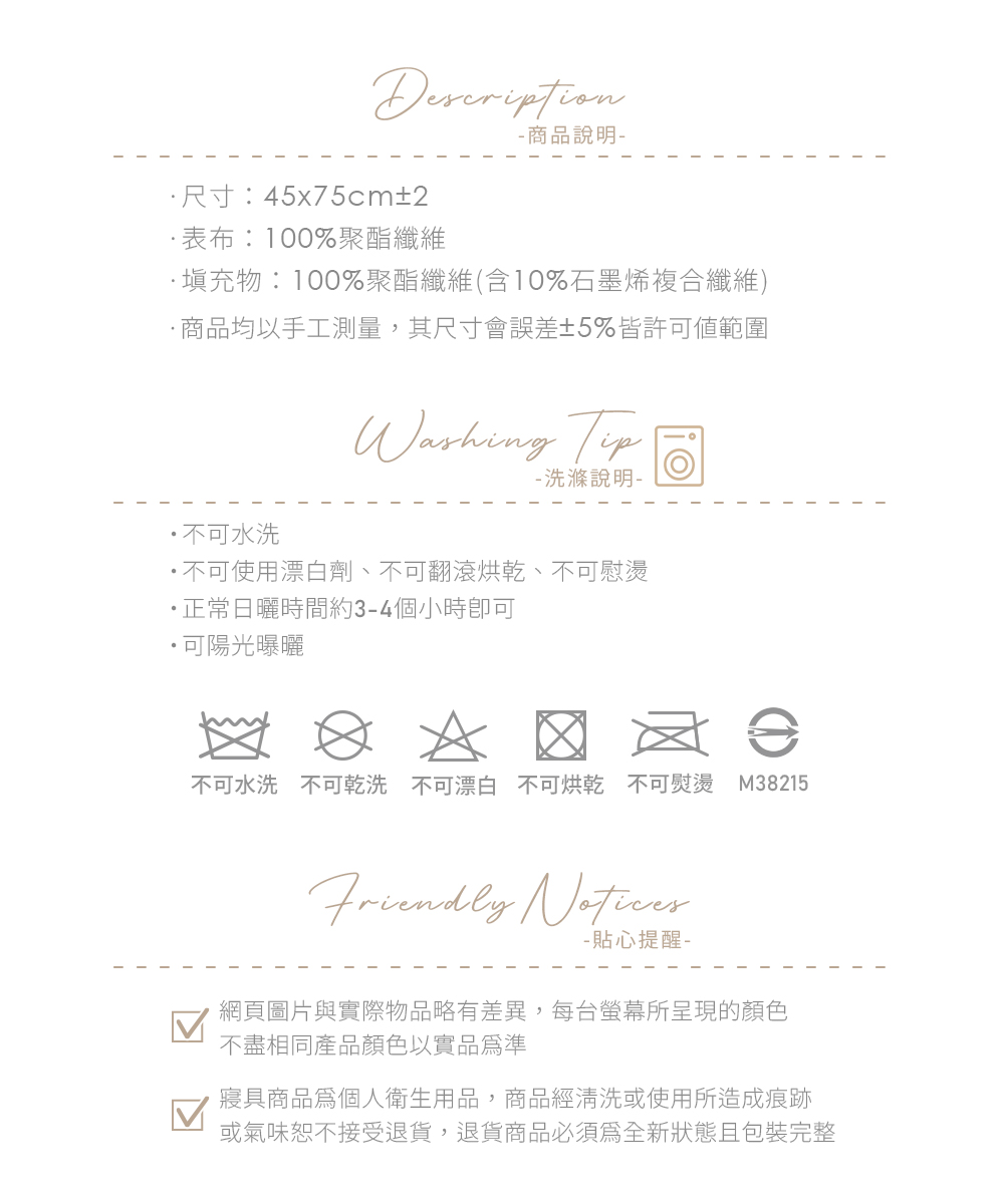 ·尺寸:45x75cm±2·表布:100%聚酯纖維·填充物:100%聚酯纖維(含10%石墨烯複合纖維)·商檢字號:M38215注意事項:·不可水洗·不可使用漂白劑、不可翻滾烘乾、不可慰燙·正常日曬時間約3-4個小時即可·可陽光曝曬·網頁圖片與實際物品略有差異,每台螢幕所呈現的顏色不盡相同,產品顏色以實品為準·寢具商品為個人衛生用品,商品經清洗或使用所造成痕跡或氣味恕不接受退貨,退貨商品必須為全新狀態且包裝完整