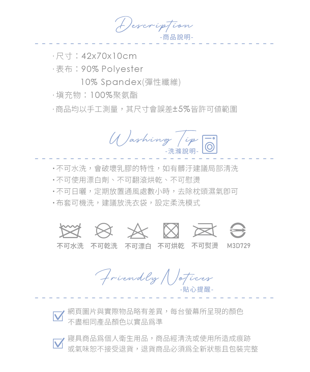 ·尺寸:42x70x10cm±2·表布:90% Polyester,10% Spandex(彈性纖維)·填充物:100%聚氨酯·商檢字號:M3D729注意事項:·不可水洗,會破壞乳膠的特性,如有髒汙建議局部清洗·不可使用漂白劑、不可翻滾烘乾、不可慰燙·不可日曬,定期放置通風處數小時,去除枕頭濕氣即可·布套可機洗,建議放洗衣袋,設定柔洗模式·網頁圖片與實際物品略有差異,每台螢幕所呈現的顏色,不盡相同產品顏色以實品為準·寢具商品為個人衛生用品,商品經清洗或使用所造成痕跡或氣味恕不接受退貨,退貨商品必須為全新狀態且包裝完整