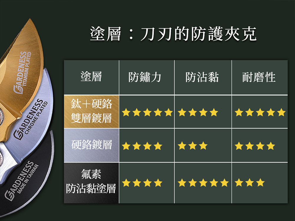 雙層鍍層刀刃: 鈦合金+硬鉻,提供更佳防鏽性、更高耐磨度、更持久的銳利度。