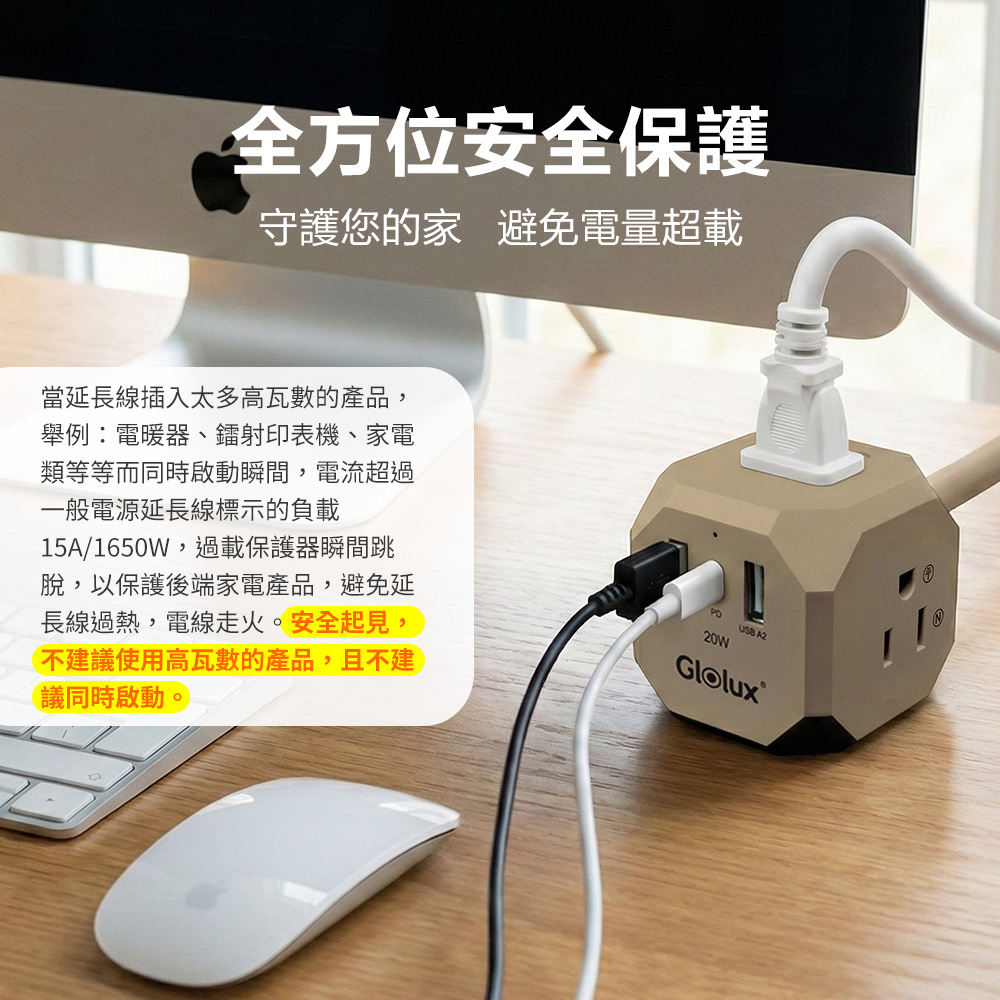 【Glolux 北美品牌】 1.8M流星錘延長線(沙色)|3 插座+2 USB+1Type-C(PD20W)