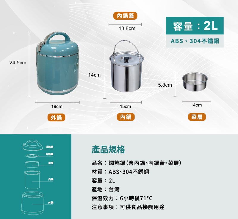 材質:ABS、304不鏽鋼尺寸外鍋19cm*19cm*H24.5cm內鍋 15cm*15cm*H14cm內鍋蓋直徑 13.8cm菜層 14cm*14cm*H5.8cm容量 2L