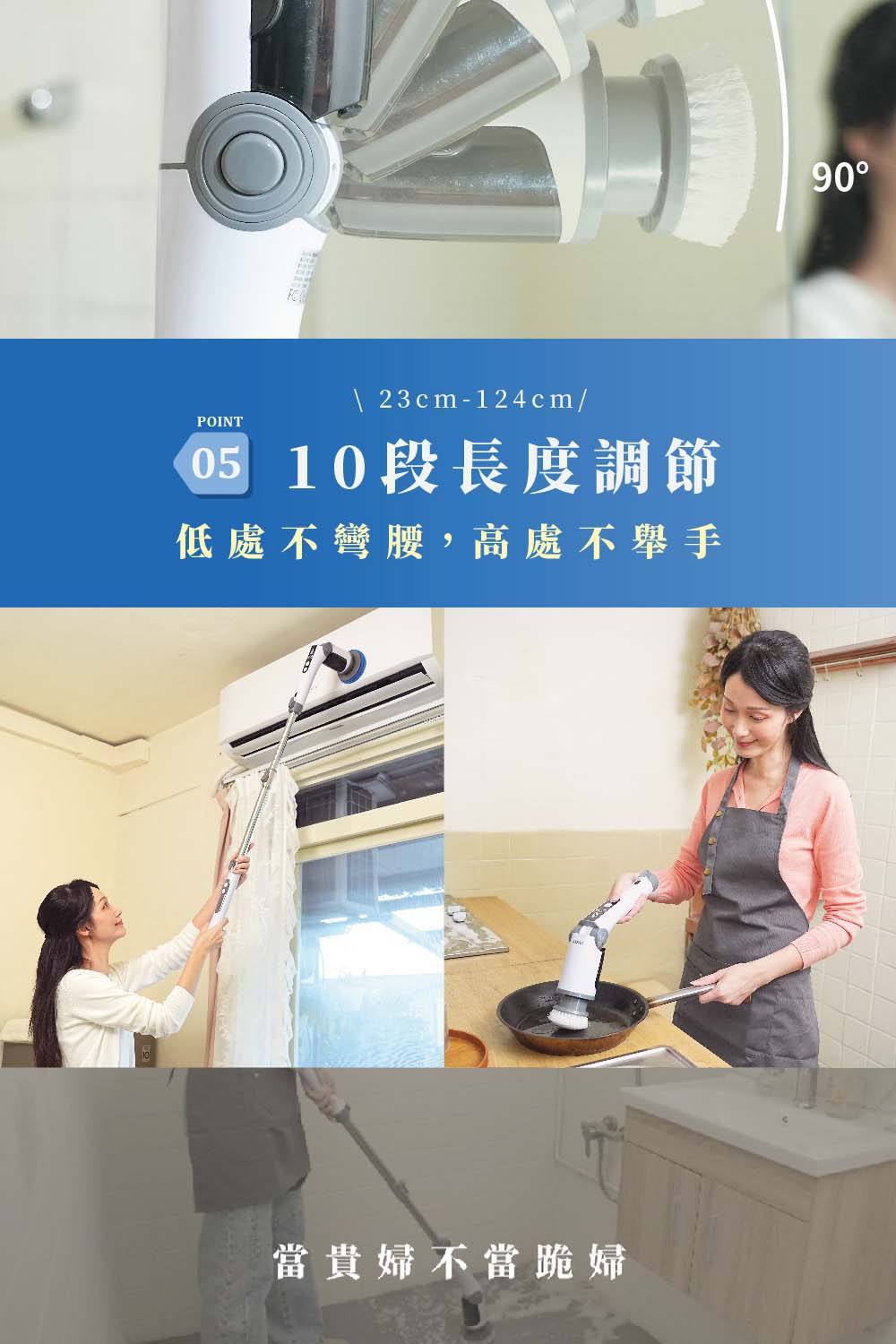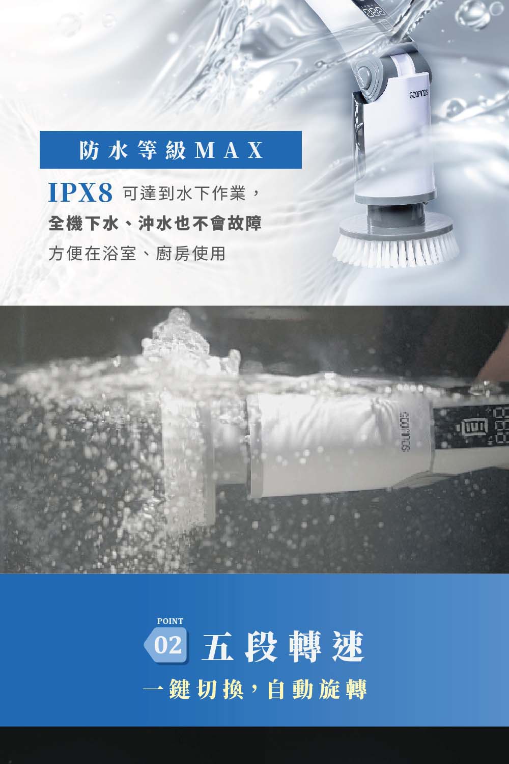五段轉速 + 40種使用角度,搞定廚房油垢與浴室水垢。
