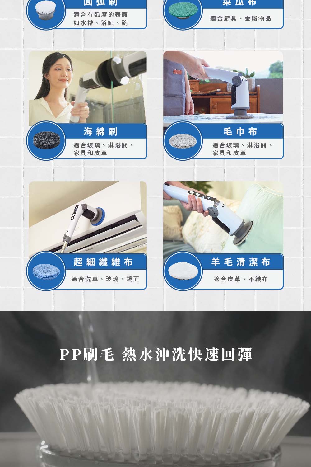 A: 贈送超多8種刷頭,除了地板之外,浴缸、洗手台、水槽、瓦斯爐甚至窗戶都可以清潔。只有想不到,沒有做不到,真正達到一機掃全家的概念