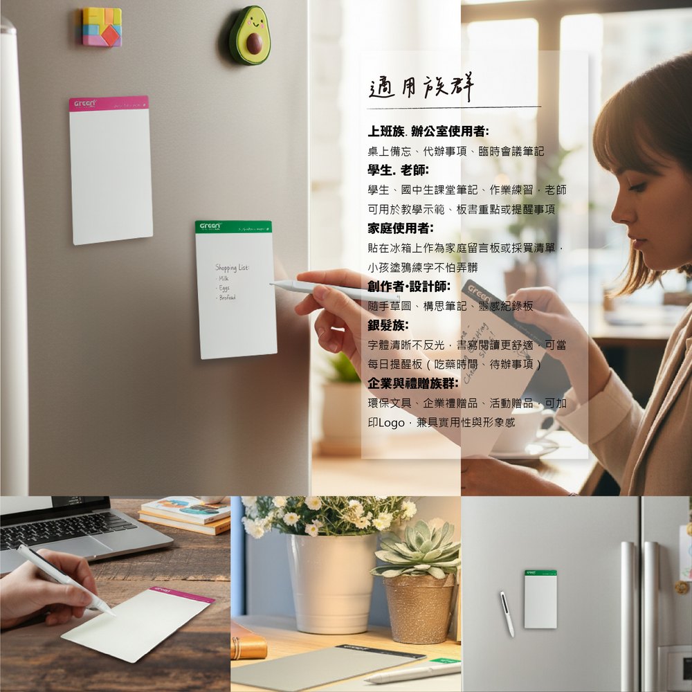 家庭使用者:貼在冰箱上作為家庭留言板或採買清單,小孩塗鴉練字不怕弄髒。