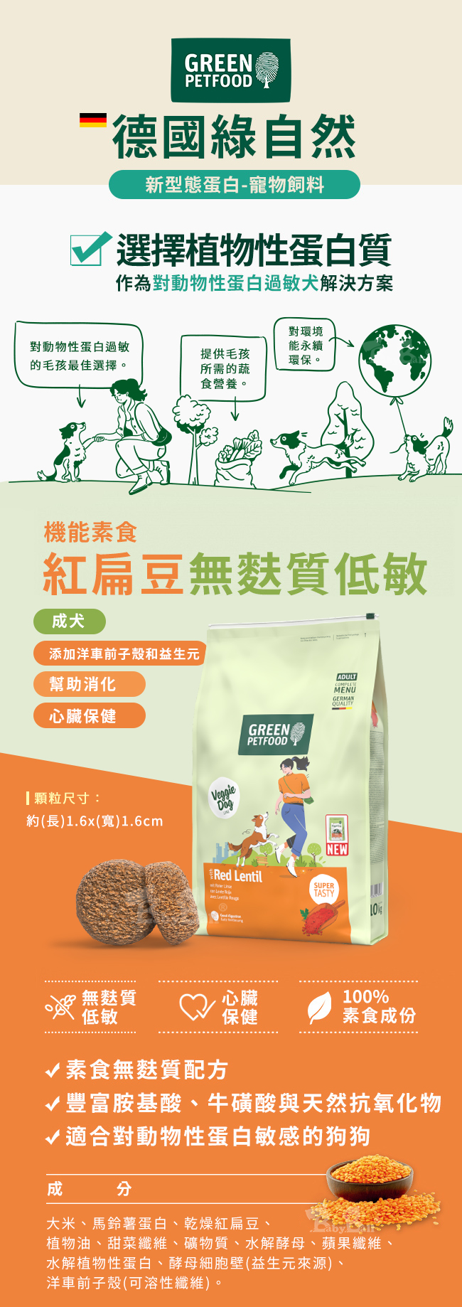 【倆寶貝精品館】Green Petfood 德國綠自然 機能素食 紅扁豆 無麩質低敏成犬飼料10KG