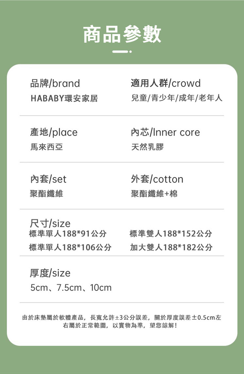 HABABY環安家居乳膠床墊(厚7.5公分) 144*75(150*80床型用)