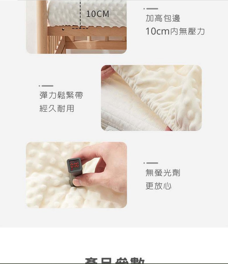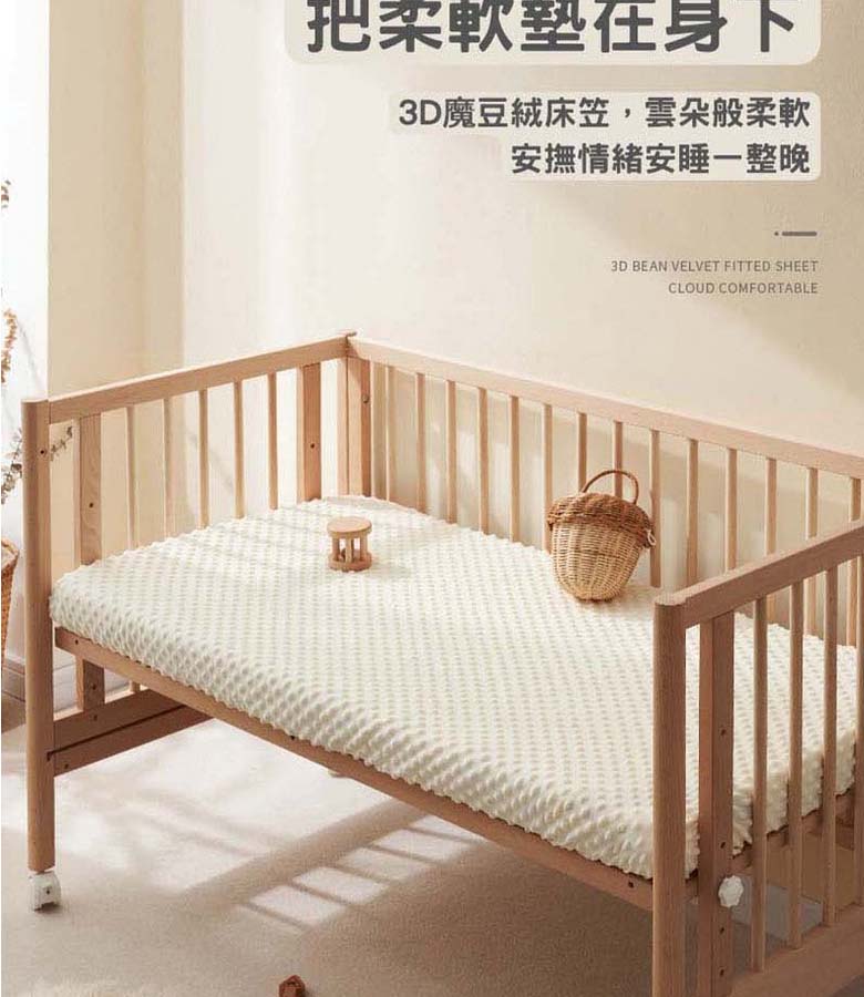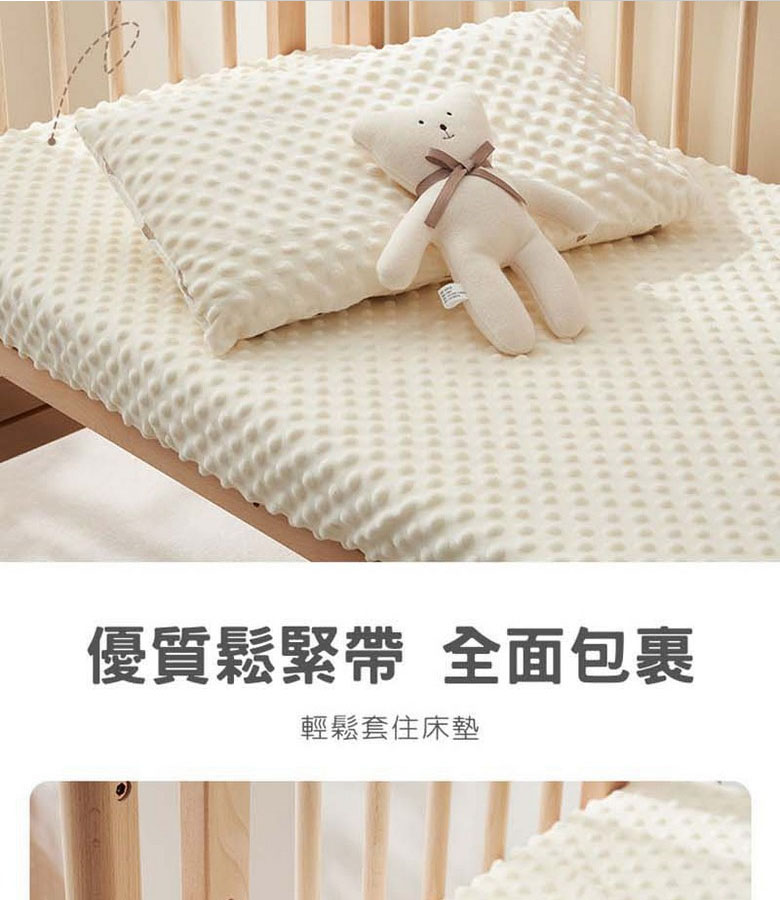 貼合床墊,不易移位:配備優質鬆緊帶,能全面包裹床墊,輕鬆套住不滑落,寶寶隨意翻滾踢動,床笠依舊平整如新,解決反復鋪床的煩惱。