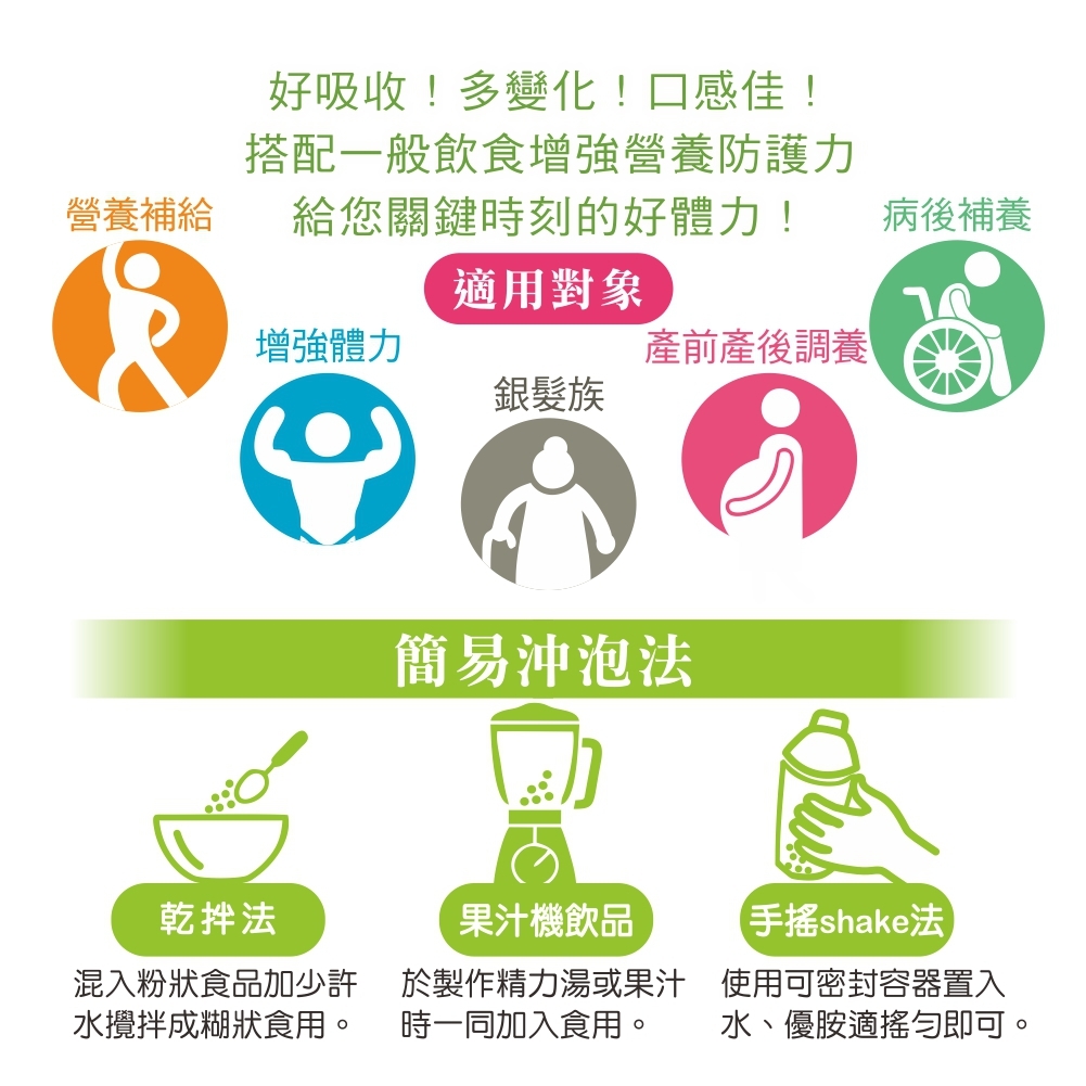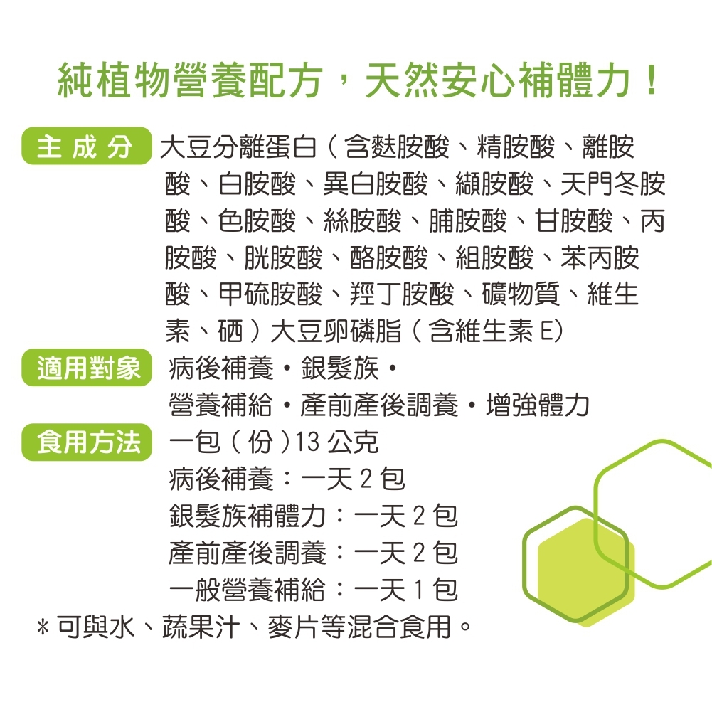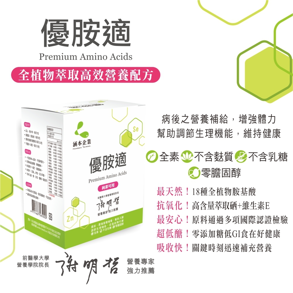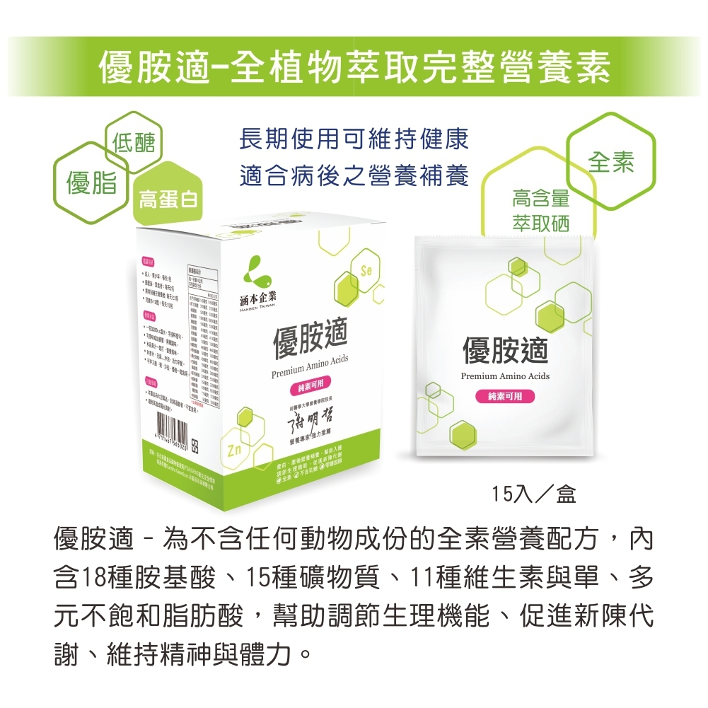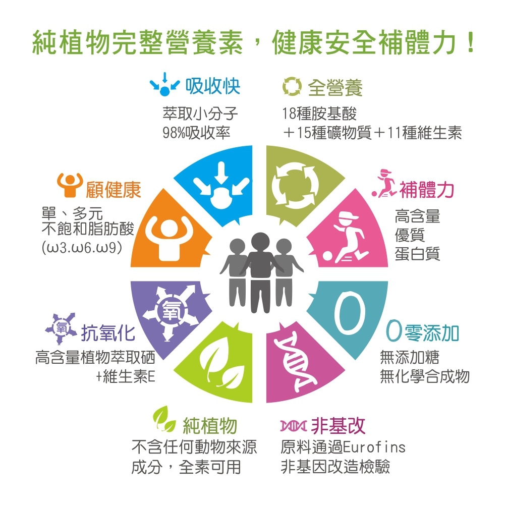 低醣‧優脂‧高蛋白+硒:全植物萃取完整營養素˙18種胺基酸˙15種礦物質˙11種維生素˙優質脂質小分子好吸收,幫助調節生理機能是維持健康與好體力的營養幫手!此外,產品均有詳細完整的成分標示、原廠檢驗報告,且通過國際OU與Halal潔食認證。