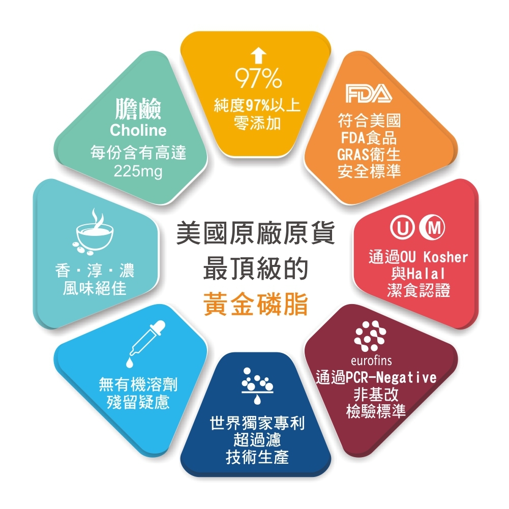 純度97%以上的世界獨家專利黃金磷脂˙純素天然非基因改造˙Omega-3˙Omega-6˙萃取保留維生素E通過多項國際檢驗與認證,獨家萃取技術保留天然風味補充植物卵磷脂最佳選擇!