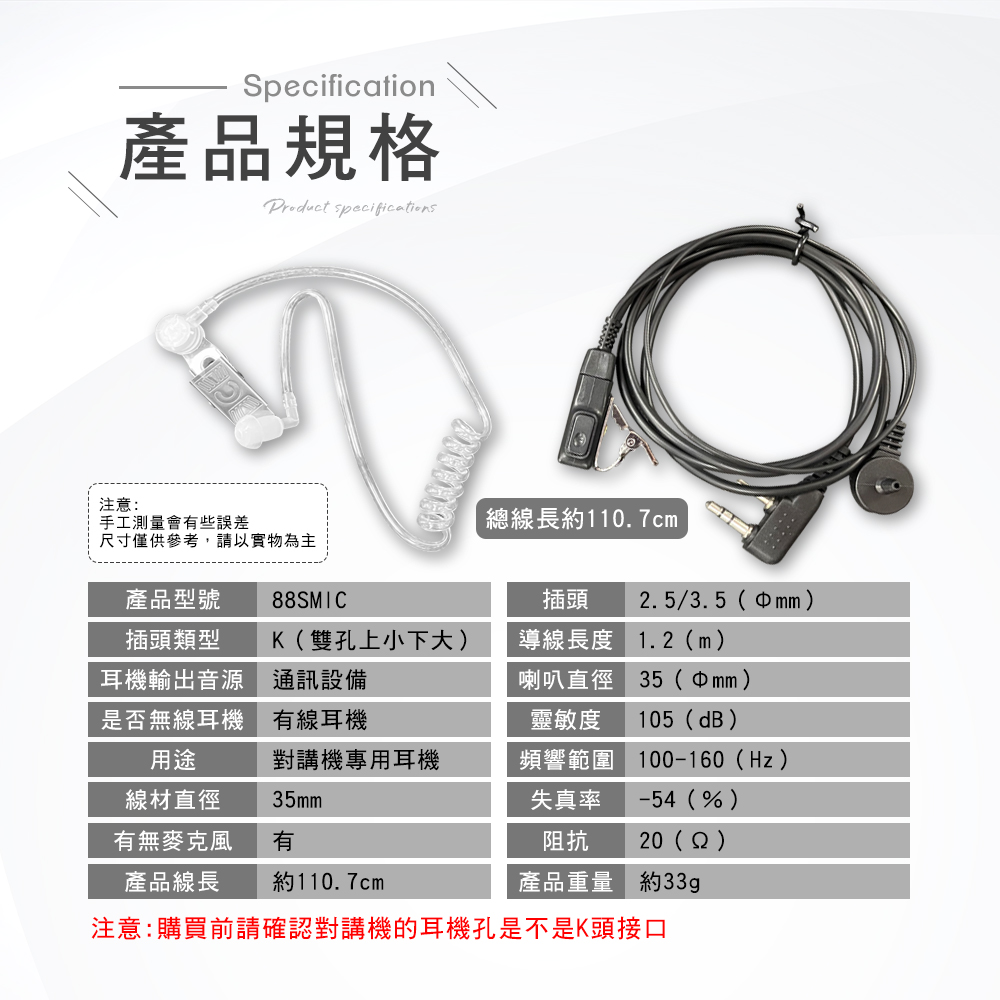 HANLIN-88SMIC 空氣導管K頭耳機麥克風(對講機專用) 適用於HL888S K頭接口類型適用於大部分對講機只要接對講機耳機孔是上小下大就能用注意:購買前請確認對講機的耳機孔是不是K頭接口產品特點:1.入耳式設計配戴更舒適2.舒適手感通話更清晰3.K頭插頭使用更廣泛4.聲波傳輸不受干擾5.軟膠材質不易纏繞6.多種配戴方式產品規格:名稱:空氣導管耳機麥克風型號:88SMIC 插頭類型:K(雙孔上小下大)耳機輸出音源:通訊設備是否無線耳機:有線耳機用途:對講機專用耳機線材直徑:35mm有無麥克風:有插頭:2.5/3.5(Φmm)導線長度:1.2(m)喇叭直徑:35(Φmm)靈敏度:105(dB)頻響範圍:100-160(Hz)失真率:-54(%)阻抗:20(Ω)產品線長:約110.7cm產品重量:約33g注意事項:※所有商品皆為手工測量,尺寸可能有1~3mm誤差。※顏色可能因拍照光線、螢幕不同等原因, 導致可能會有色差。 一切以實物為主。※避免高溫、潮濕或強磁場環境。