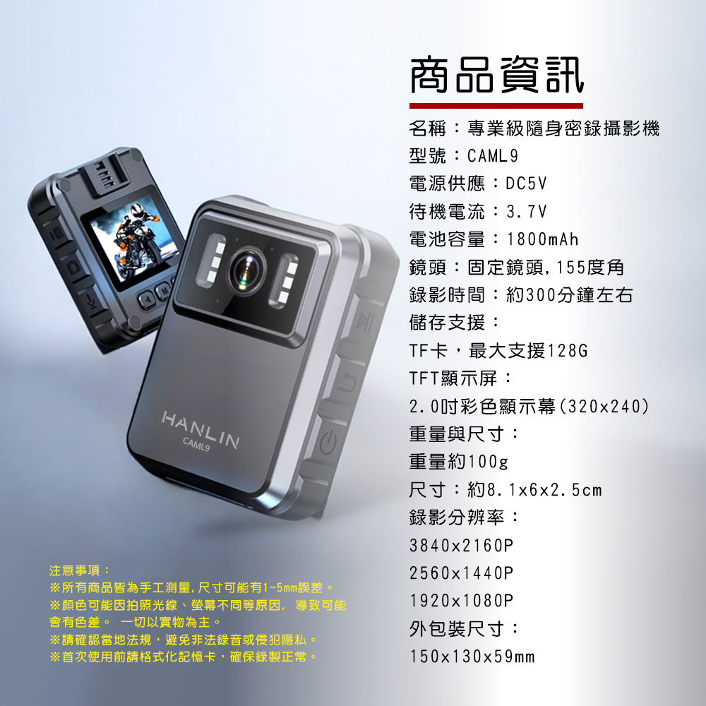 HANLIN-CAML9 專業級隨身密錄攝影機 P65 防水 高畫質 2K 警用 外送 攝錄影機 密錄器 帶螢幕運動攝影機 微型攝影機 便攜式 行車記錄器 隨身記錄器產品特點:🔹 IP65防水設計:應對各種天氣,戶外、執勤、外送皆適用。🔹 2K高畫質錄影:提供高清影像,畫面細膩清晰。🔹 紅外線夜視:使夜間錄影無憂。🔹 155°超廣角鏡頭:更大視野範圍,完整記錄重要瞬間。🔹 長效續航:內建1800mAh電池。🔹 高擴充性:支援Micro SD 最高達128G記憶卡,存儲空間靈活擴充。適合警用執勤、外送記錄、錄影紀錄等多種場景,確保重要時刻不遺漏!產品規格:名稱:專業級隨身密錄攝影機型號:CAML9電源供應:DC5V待機電流:3.7V電池容量:1800mAh鏡頭:固定鏡頭,155度角錄影時間:約300分鐘左右外包裝尺寸:150x130x59mm儲存支援:TF卡,最大支援128GTFT顯示屏:2.0吋彩色顯示幕(320x240)主機重量與尺寸:重量約100g/尺寸:約8.1x6x2.5cm錄影分辨率:3840x2160P、2560x1440P、1920x1080P配件內容:主機x1、包裝盒x1、TYPE-C線x1、背夾支架x1、腳踏車支架x1、說明書x1BSMI:R39542 / RoHS國際條碼4718287257777注意事項:※所有商品皆為手工測量,尺寸可能有1~5mm誤差。※顏色可能因拍照光線、螢幕不同等原因, 導致可能會有色差。 一切以實物為主。※請確認當地法規,避免非法錄音或侵犯隱私。※首次使用前請格式化記憶卡,確保錄製正常。※錄製後請及時備份檔案,防止數據遺失。※避免高溫、潮濕或強磁場環境,確保設備穩定運作。