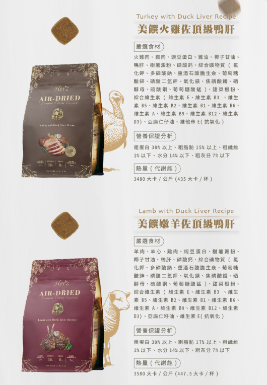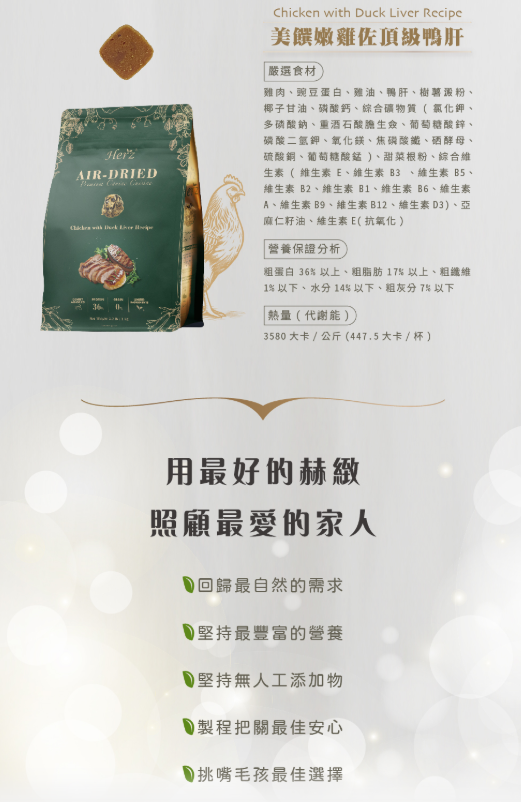 Herz 赫緻 無穀低溫風乾 美饌火雞佐頂級鴨肝 犬糧 狗飼料 1KG