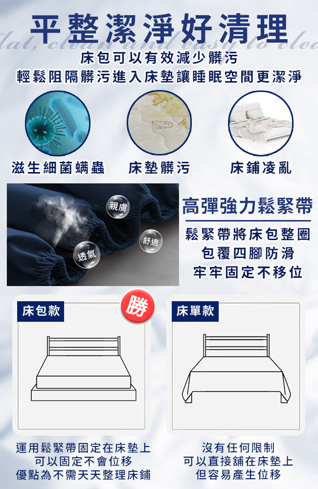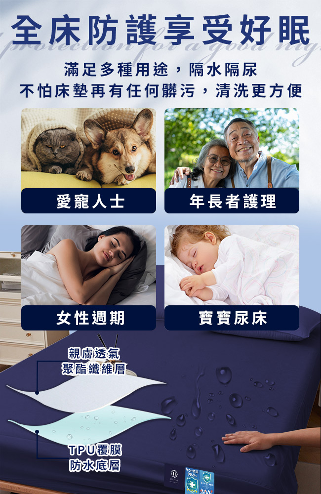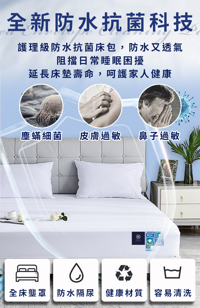 ◆專業抗菌防水設計,專利抗菌布,防蟎抗菌,安心健康 ◆台灣精製MIT,品質優良,精緻工序,360度包覆鬆緊帶固定,各種睡姿不凌亂 ◆特殊TUP防水透氣底布設計,可以有效阻絕水分滲透且透氣,好像會呼吸一樣! ◆表布做吸濕排汗專利處理,易洗快乾,拆洗容易,收納方便不佔空間 ◆床包式設計可完整包覆床墊,有效延長床墊整潔與壽命
