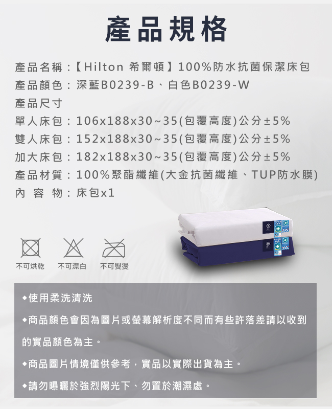 產品名稱:【Hilton 希爾頓】100%防水抗菌保潔床包 產品顏色:深藍B0239-B、白色B0239-W 產品尺寸 單人床包:106x188x30~35(包覆高度)公分±5%(3.5尺x6.2尺) 雙人床包:152x188x30~35(包覆高度)公分±5%(5尺x6.2尺) 加大床包:182x188x30~35(包覆高度)公分±5%(6尺x6.2尺) 包裝尺寸:40x30x3公分±5% 淨重/毛重 單人:0.5公斤/0.6公斤±5% 雙人:0.6公斤/0.7公斤±5% 加大:0.7公斤/0.8公斤±5% 產品材質:100%聚酯纖維(大金抗菌纖維、TUP防水膜) 內容物:床包x1 商檢字號:M37023 產地:台灣