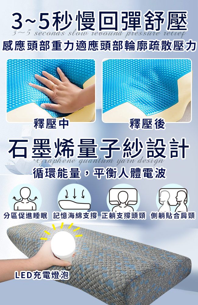 ◆專利量子紗,最新奈米科技讓您在能量的包覆中更健康◆添加石墨烯黑科技抑菌纖維,健康好眠◆智慧分區睡眠,正睡側睡貼合呵護◆涼感冷凝慢回彈記憶枕,恆溫舒爽深層睡眠◆石墨烯量子紗表布◆3~5秒慢回彈釋壓,疏散頭部壓力