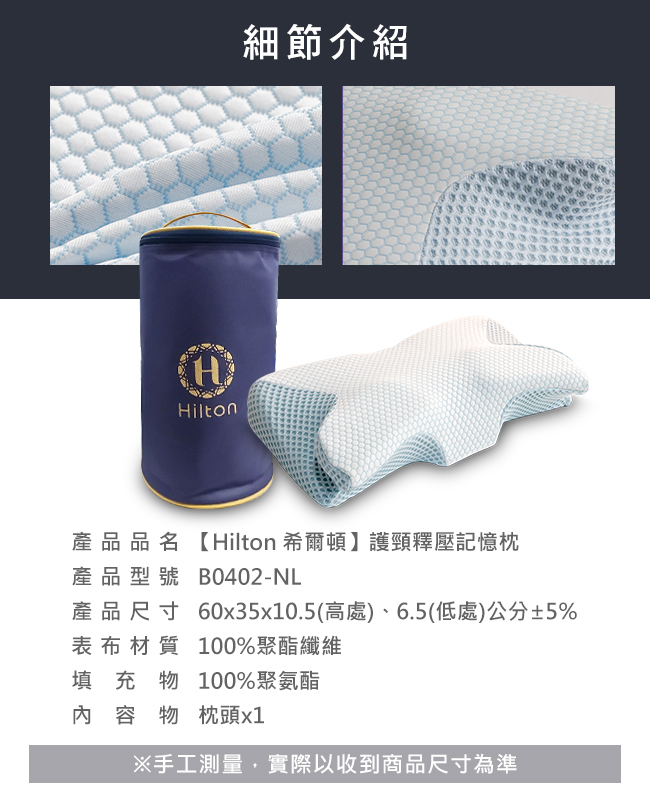 產品名稱:【Hilton 希爾頓】護頸釋壓記憶枕產品型號:B0402-NL產品尺寸:60x35x10.5(高處)、6.5(低處)公分±5%包裝尺寸:33x18x18公分±5%淨重/毛重:0.8公斤/1公斤表布材質:100%聚酯纖維填充物:100%聚氨酯內容物:枕頭x1產地:中國商檢字號:M37023