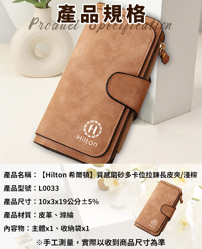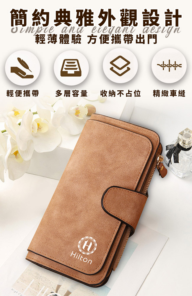 產品名稱:【Hilton 希爾頓】質感磨砂多卡位拉鍊長皮夾/淺棕