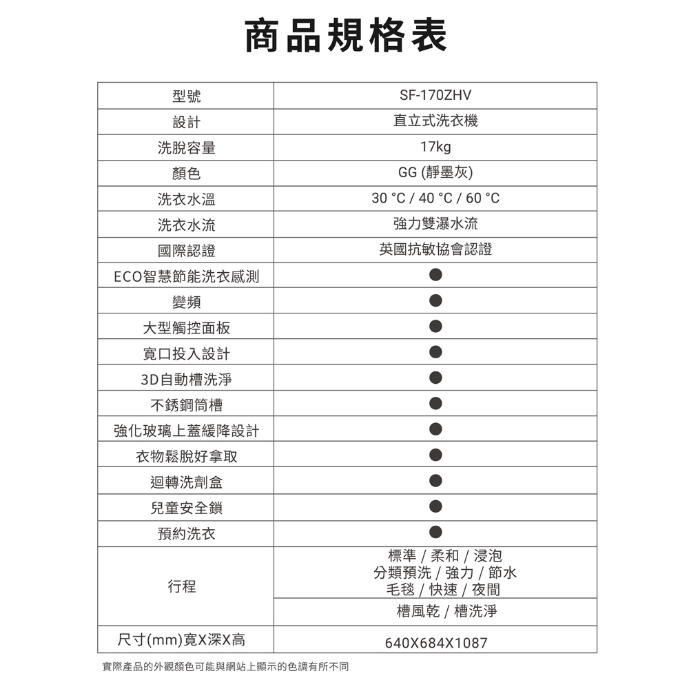 商品特色:夜間靜洗行程 減振抑制噪音新減振控制系統3段溫控洗淨 除菌抗蟎雙瀑水流 4段水洗效能ECO智慧節能洗衣感測分類預洗 二批衣物1次洗淨3D自動全槽洗淨 英國防敏協會認證不銹鋼槽外側 內側 底側全面清潔迴轉洗劑盒 易清潔保養大型觸控面板 前傾易拿設計減少衣物糾結 抛鬆脫水設計國家金級省水標章認證商品規格:型號:SF170ZHVGG顏色:靜墨灰(GG)容量:17kg電壓:110V / 60Hz尺寸:640 * 684 * 1087 mm重量:49 kg產地:泰國保固:全機1年、機板,運轉組3年、馬達,壓縮機5年BSMI:R31270貨源:公司貨本商品資訊由網路及官網收集彙整而成,僅供參考,如有更新或異動不另外通知,正確商品資訊及規格以實機為準。鑑賞期非試用期,產品一經拆箱、插電及使用皆會影響您退貨權利。廢四機回收資訊:如需回收廢四機請於下單時備註,如未於訂單備註,後續需另派工收回將酌收派工費用500~1200元(跨區費另計)新購公告指定規格之電視機、洗衣機、電冰箱或冷、暖氣機時,販賣業者應提供同項目、數量、時間及同送達地址之廢四機回收(搬、載運)無償服務。但不包含為搬運、拆卸而動用大型機具、工程或危險施工等。消費者本人簽名確認已被口頭告知或知悉上述權益。本站配合環保署廢四機回收服務,本公司廢四機回收專線:0800-550678,環保署資源回收專線0800-085717。