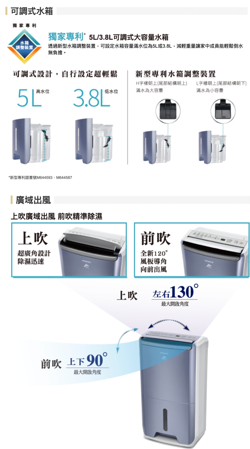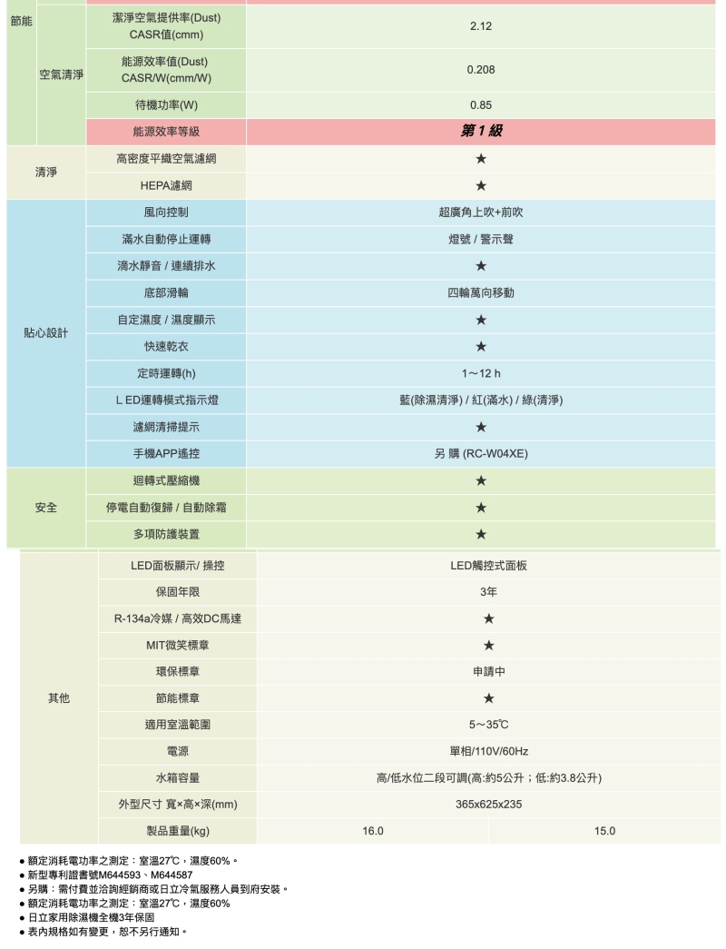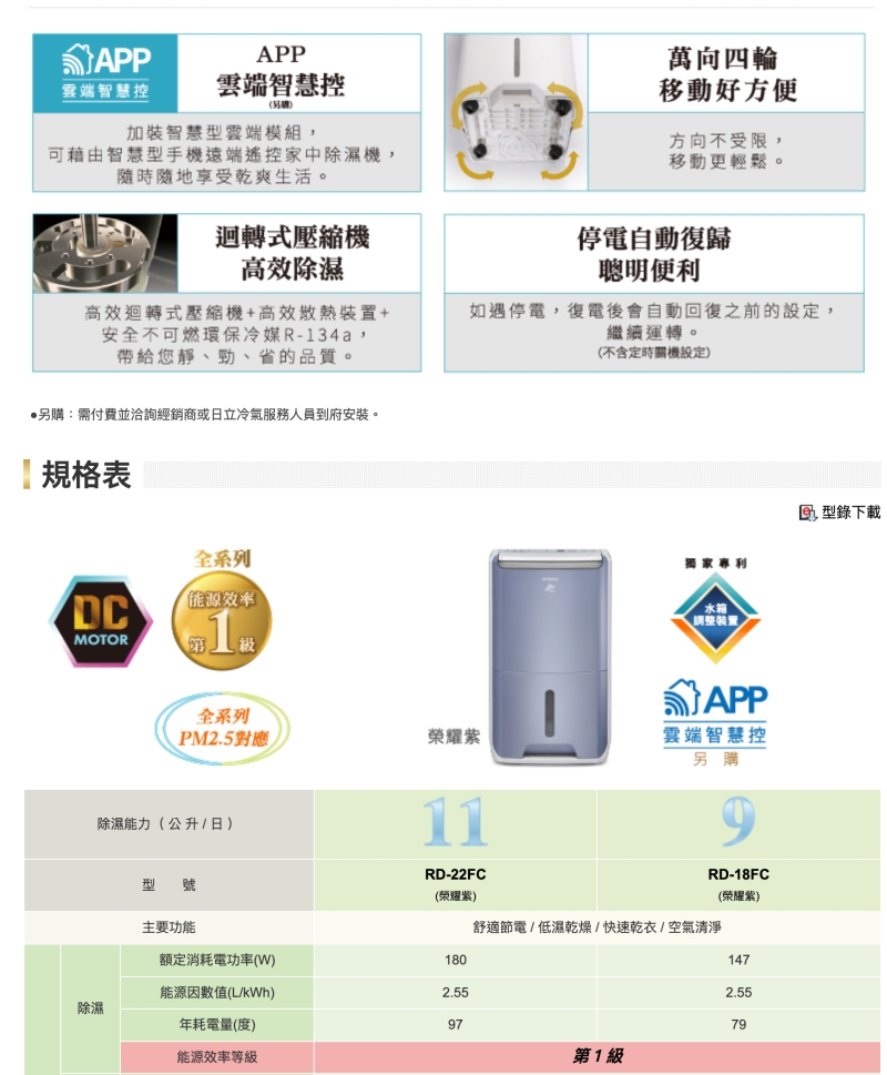 【商品名稱】HITACHI 日立一級能效 11公升 清淨型除濕機 RD-22FC 榮耀紫【原產地】台灣【型號】RD-22FC【顏色】榮耀紫【節能/除濕】 .除濕能力:11 (公升/日) .能源效率等級:第1級【空氣清淨】 .潔淨空氣提供率(Dust)CASR值(cmm):2.12 .能源效率值(Dust)CASR/W(cmm/W):0.208 .待機功率(W):0.85 .能源效率等級:第1級【清淨】 .高密度平織空氣濾網:★ .HEPA濾網:★【貼心設計】 .風向控制:超廣角上吹+前吹 .滿水自動停止運轉:燈號 / 警示聲 .滴水靜音 / 連續排水:★ .底部滑輪:四輪萬向移動 .自定濕度 / 濕度顯示:★ .快速乾衣:★ .定時運轉(h):1~12 h .LED運轉模式指示燈:藍(除濕清淨) / 紅(滿水) / 綠(清淨) .濾網清掃提示:★ .手機APP遙控:另 購 (RC-W04XE)【安全】 .迴轉式壓縮機:★ .停電自動復歸 / 自動除霜:★ .多項防護裝置:★【其他】 .LED面板顯示/ 操控:LED觸控式面板 .R-134a冷媒 / 高效DC馬達:★ .MIT微笑標章:★ .環保標章:申請中 .節能標章:★ .適用室溫範圍:5~35℃ .電源:單相/110V/60Hz .水箱容量:高/低水位二段可調(高:約5公升;低:約3.8公升) .外型尺寸 寬×高×深(mm):365x625x235 .製品重量(kg):16【商品保固】 .3年保固【BSMI商檢字號】R41010【商品特點】 .雲端智慧控 .雙重清淨過濾 .高效除溼#HITACHI #HITACHI 日立 #一級 #能效 #11 #公升 #清淨型 #除濕機 #RD22FC #榮耀 #紫