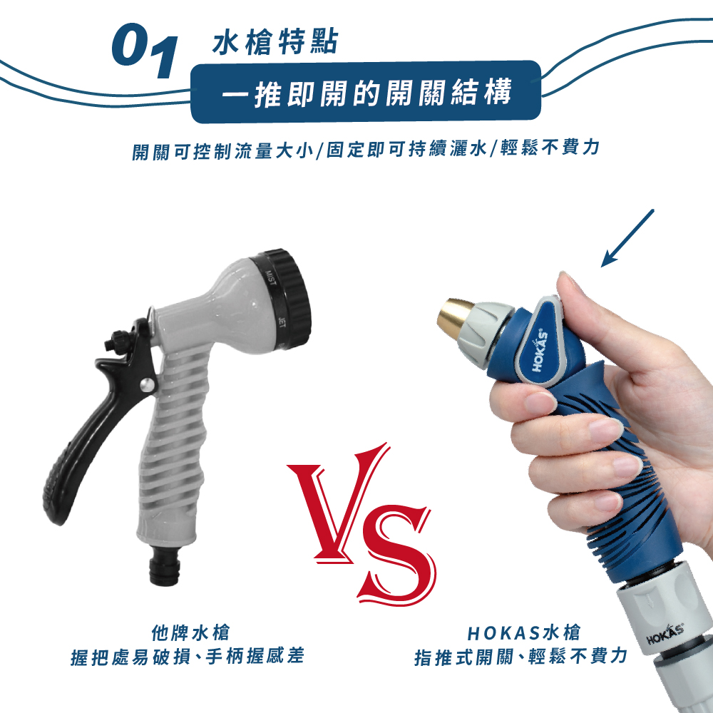 新改款水槍特點水槍開關使用新型材質,更加的滑順、手感更完美。HOKAS水槍針對多種使用目的設計,可變化出不同灑水模式!有兩種形式的水槍可以選擇。戶外地板、門窗清潔及洗車時,